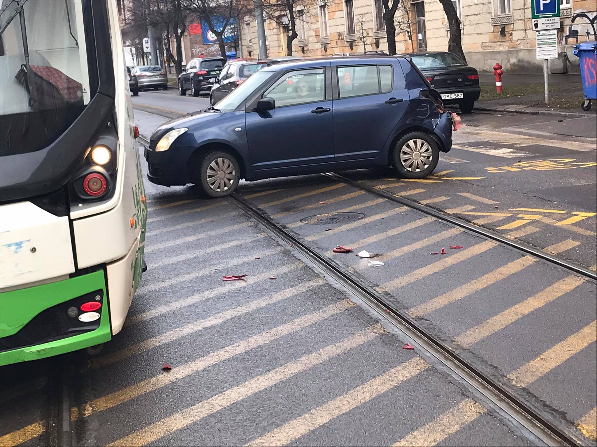 Péntek reggel, 8 óra magasságában történt az anyagi káros baleset. Elsődleges információink szerint egy személyautó figyelmetlenül kanyarodott és a villamos beleszaladt a kocsi bal hátuljába. Személyi sérülés nem történt.