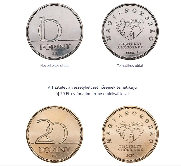 Kiemelte: az új érmék névértékes oldala ugyanaz maradt, a túloldalon a megszokott címerábrázolás és a magyar nőszirom motívum helyett Magyarország felirat olvasható, alatta szív alakot formálva a vészhelyzetben helytálló különböző foglalkozásúak sematikus ábrázolása jelenik meg, alatta pedig a Tisztelet a hősöknek felirat olvasható.