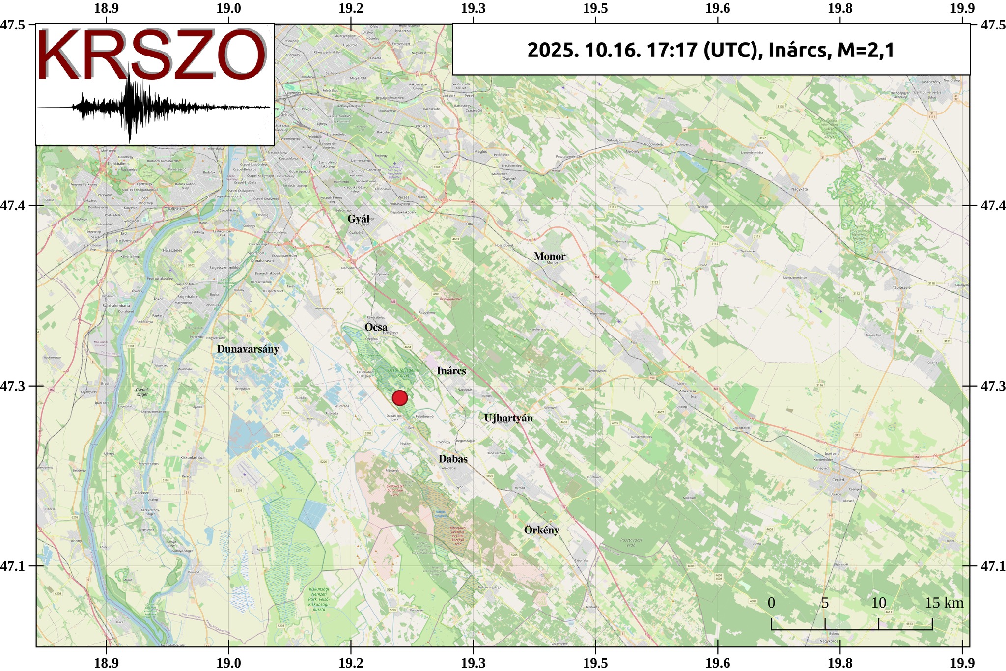 A HUN-REN Földfizikai és Űrtudományi Kutatóintézet Kövesligethy Radó Szeizmológiai Obszervatóriumának közleménye szerint 2025. október 16-án, helyi idő szerint 19 óra 17 perckor 2,1-es magnitúdójú földrengés keletkezett a Pest vármegyei Inárcs közelében.