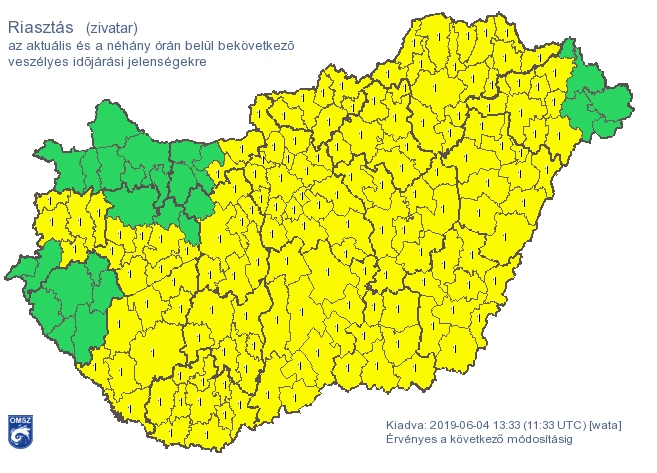 A zivatarok, az erős szél és a jégeső miatt egyébként az egész ország területén elsőfokú figyelmeztetés is érvényben van.