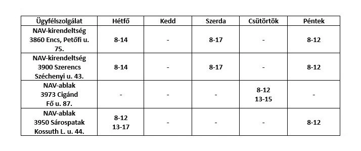 Az encsi, a szerencsi, a cigándi és a sárospataki NAV ügyfélszolgálatokon módosul az ügyfélfogadás.