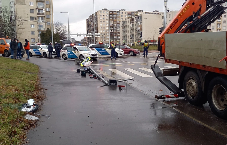 A veszélyesen megdőlt oszlop miatt az érintett útszakaszt lezárták.
