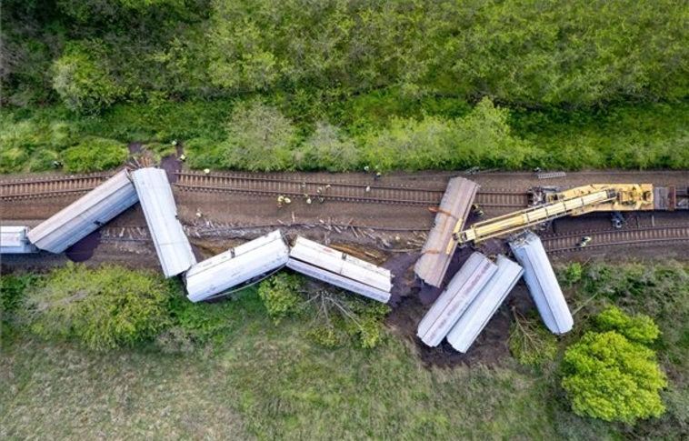 Drónnal készített képen az előző nap Hajdúhadház és Újfehértó között kisiklott tehervonat kocsijai 2023. május 8-án. Valószínűleg több napig is eltart a vasúti pálya helyreállítása a Záhonyból Hegyeshalmon át Ausztriába tartó, vasércet szállító tehervonat balesete után.