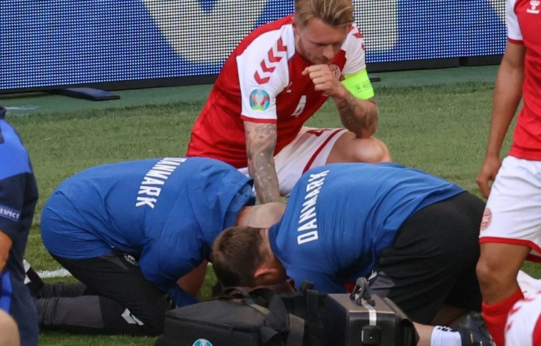 A dán Christian Eriksen összeesett a pályán, újraélesztik, emiatt az első félidő végén félbeszakadt a Dánia-Finnország mérkőzés a részben budapesti rendezésű labdarúgó Európa-bajnokságon, Koppenhágában, a B csoportban.