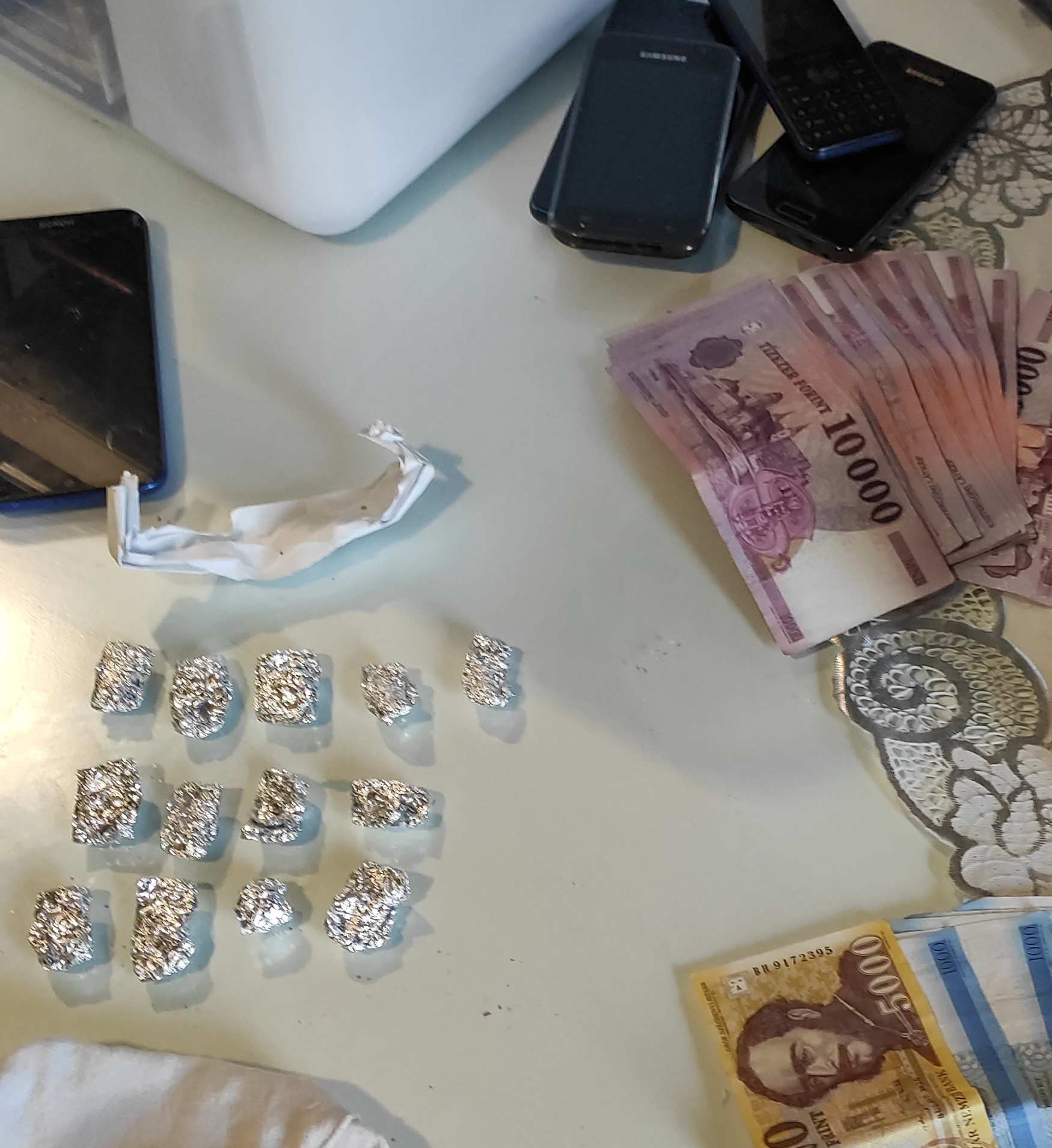 A gyanúsítottaknál házkutatásokat tartottak a rendőrök és kábítószergyanús anyagokat, készpénzt és a szer értékesítéséhez használatos mérleget, csomagolóanyagokat találtak, illetve foglaltak le. A kábítószergyanús anyagok vizsgálatára a nyomozók igazságügyi vegyész szakértőt rendeltek ki.