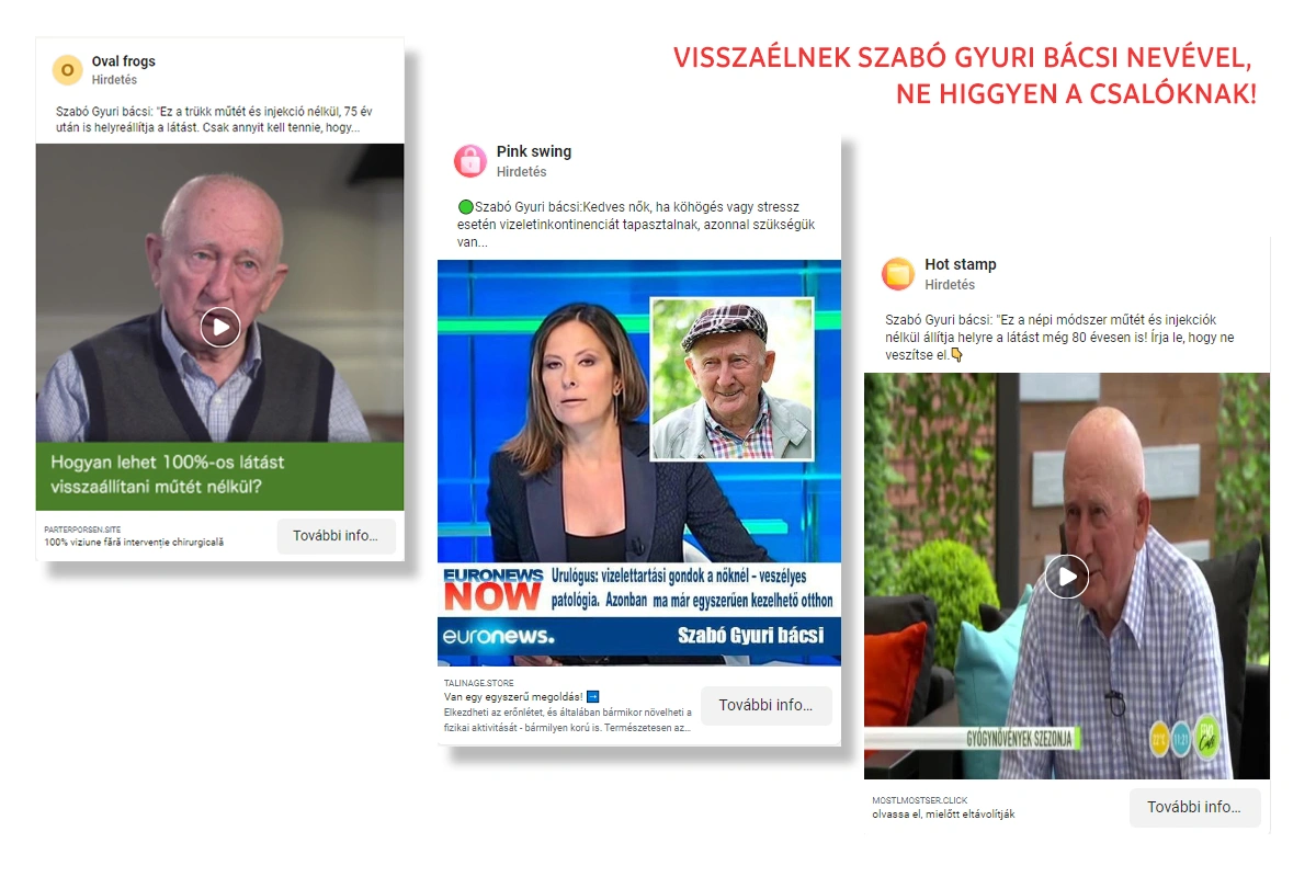Szerkesztőségünknek küldött levelében azt írta, hogy édesapja „nevében” most már körülbelül egy hónapja folyik egy intenzív reklámhadjárat, főleg a közösségi médiában: ismeretlen, külföldi weboldalak, fake profillal különböző termékeket igyekeznek eladni hiszékeny embereknek, azt a látszatot keltve, mintha a termékeket Szabó Gyuri bácsi ajánlaná.