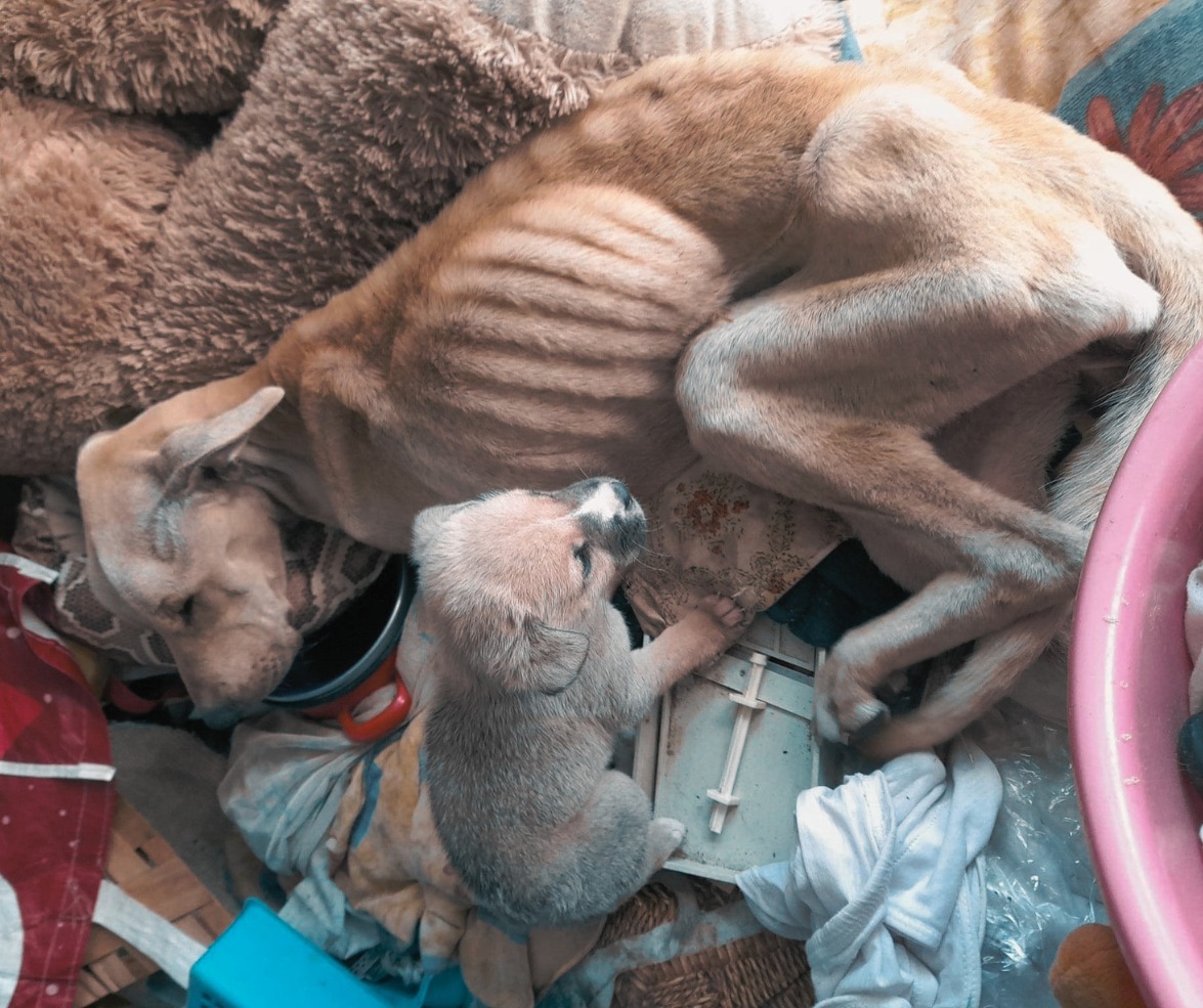 A Miskolci Állatsegítő Alapítvány szerdán posztolt arról, hogy hozzájuk került Müzli, a 2 éves nőstény kutya, egy életben maradt kölykével. A feltett kép magáért beszélt: az állat csonttá soványodva.
