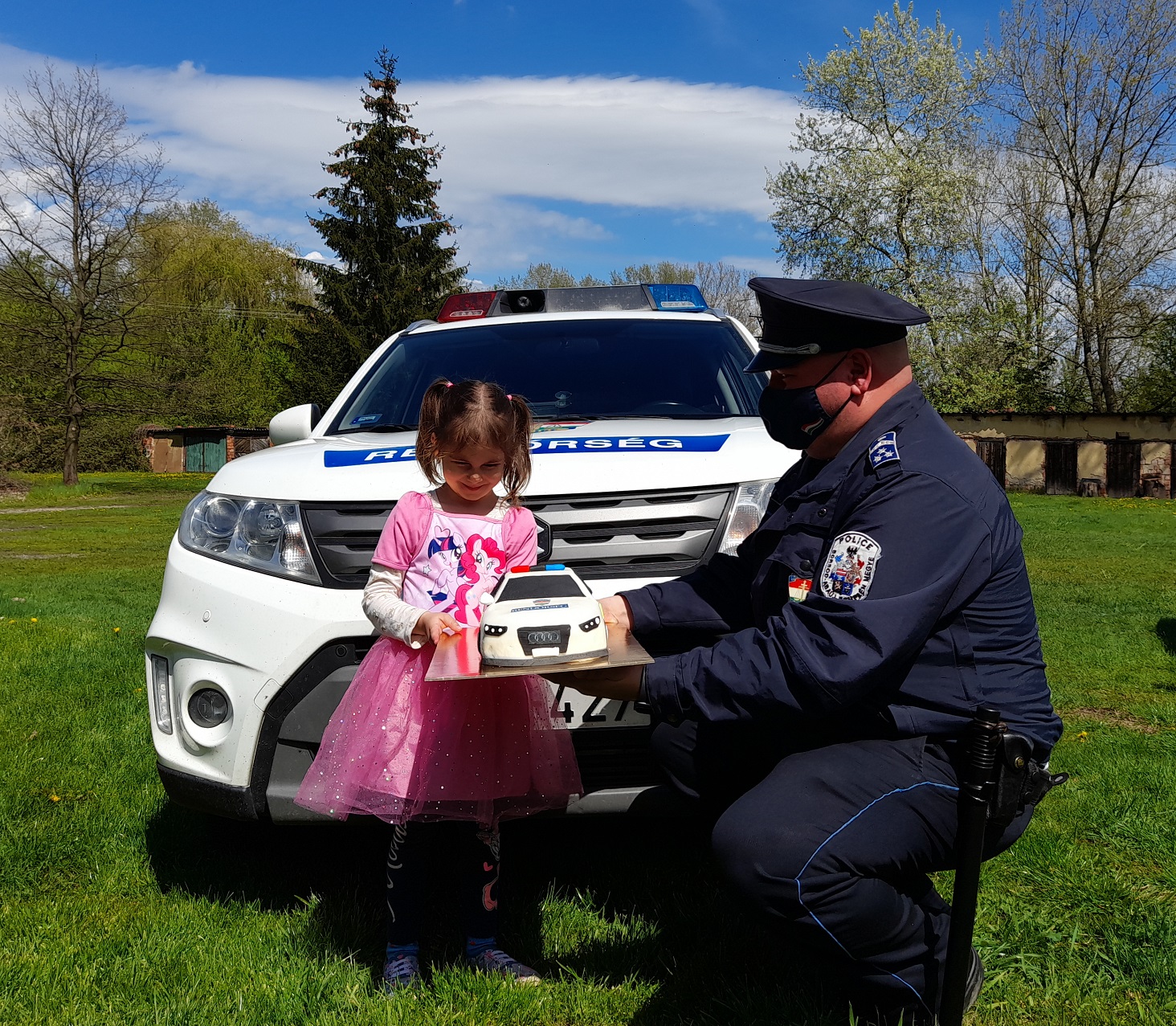 Az ünnepeltet szemmel láthatóan a rendőrautó nyűgözte le legjobban, mind valódi, mind ehető, torta formájában egyaránt. A legfinomabb rendőrautó, ahogy fogalmazott a leendő munkatárs, miközben a szolgálati gépjárművet áhítattal körbejárta.