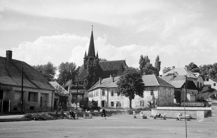 Petőfi Sándor tér, háttérben fent a Deszkatemplom – írja az 1953-ban készült és a Fortepan gyűjteményében megtalálható felvétel szövege.
