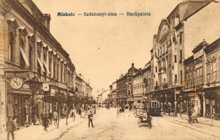 A Széchenyi utcai Bankpalota áll a régi képeslap középpontjában.