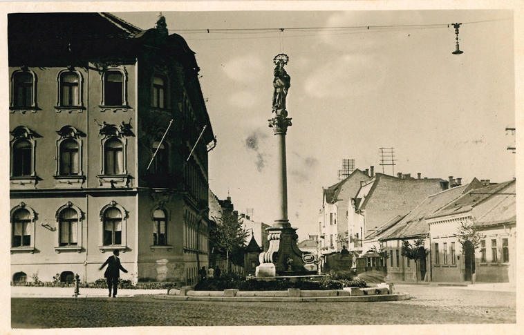 A képpár központi eleme a Bársony-ház, ami az egykori Derékpiac helyén áll.