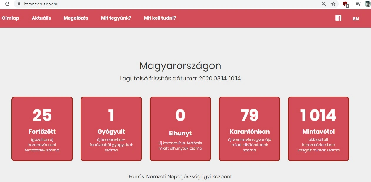 Cikkünk megjelenésekor a koronavirus.gov.hu számlálója a 10:14-es frissítés szerint 1014 mintavételről ír, és 79 emberről, akik karanténban vannak. Továbbra is 1 gyógyult esetet tartanak nyilván.