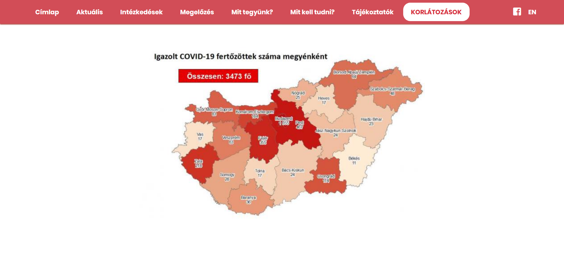 Az oldal térképe alapján továbbra is Budapesten (1655 ember) és Pest megyében (467) van a legtöbb fertőzött. Ezt követi Fejér (355), Zala (218), Komárom-Esztergom (184) és Csongrád megye (114), megyénkben 64 beteget regisztráltak. Békés megyében (11) van a legkevesebb fertőzött Magyarországon.