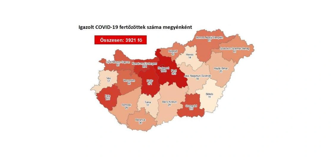 Az oldal térképe alapján továbbra is Budapesten (1866 ember) és Pest megyében (563) van a legtöbb fertőzött. Ezt követi Fejér megye (371), Komárom-Esztergom megye (264), Zala megye (255) és Csongrád megye (115). Békés megyében (11) van a legkevesebb fertőzött Magyarországon.