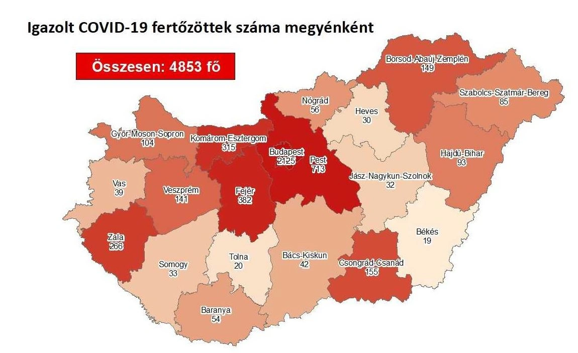 A kormányzati portál térképe alapján eddig Budapesten (2125) és Pest megyében (713) regisztrálták a legtöbb fertőzöttet. Ezt követi Fejér (382), Komárom-Esztergom (315), Zala (266), Csongrád-Csanád (155), Borsod-Abaúj-Zemplén (149), Veszprém (141) és Győr-Moson-Sopron megye (104), a sor végén pedig Békés megye áll (19).