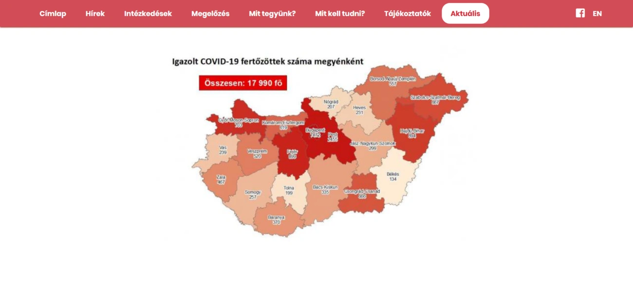 Az oldal térképe alapján eddig Budapesten (7472) és Pest megyében (2455) regisztrálták a legtöbb fertőzöttet. Ezt követi Fejér (899), Győr-Moson-Sopron (703), Hajdú-Bihar (694), Szabolcs-Szatmár-Bereg (667), Csongrád-Csanád megye (666) és Komárom-Esztergom (619). Borsod-Abaúj-Zemplén megyében egy nap alatt 51 új beteget regisztráltak, a számuk jelenleg 557. A fertőzésben legkevésbé érintett megye Békés (134).
