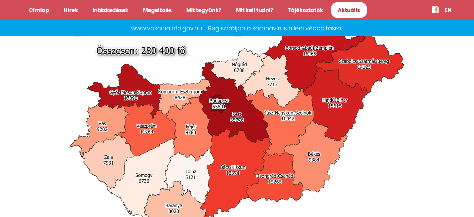 Az oldal térképe szerint eddig Budapesten (55 801) és Pest megyében (35 776) regisztrálták a legtöbb fertőzöttet. Ezt követi Győr-Moson-Sopron (17 090), Borsod-Abaúj-Zemplén (16 465), Hajdú-Bihar (15 612) és Szabolcs-Szatmár-Bereg megye (14 125). A fertőzésben legkevésbé érintett megye Tolna (5121).