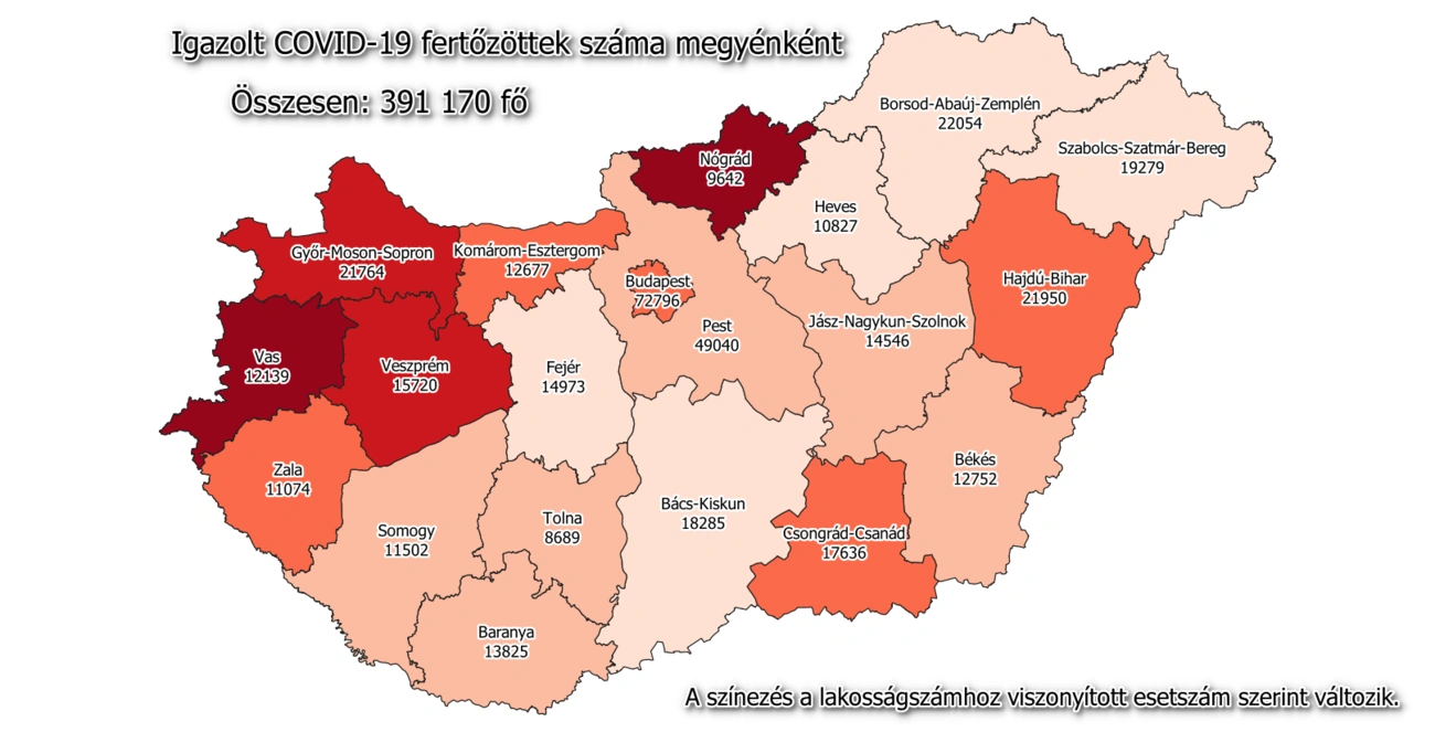 1548 újabb magyar állampolgárnál mutatták ki az új koronavírus-fertőzést (COVID-19), ezzel 391 170 főre nőtt a hazánkban beazonosított fertőzöttek száma - írja a koronavirus.gov.hu kormányzati portál. Elhunyt 94 többségében idős, krónikus beteg, így az elhunytak száma 13 931 főre emelkedett. A gyógyultak száma folyamatosan nő, jelenleg 299 989 fő, az aktív fertőzöttek száma 77 250 fő. 4014 koronavírusos beteget ápolnak kórházban, közülük 321-en vannak lélegeztetőgépen.