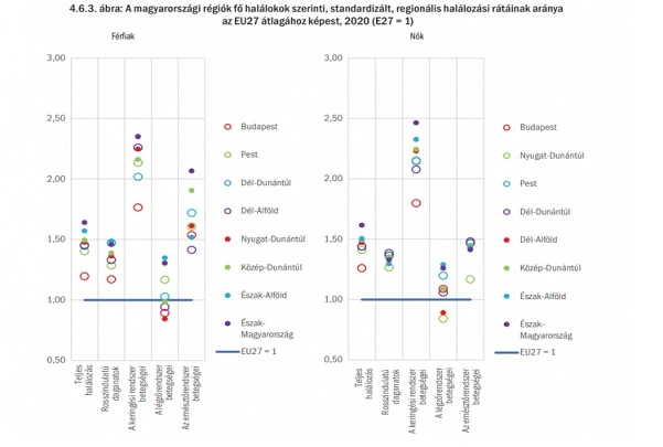 A fenti ábrán a fő halálokok láthatók a férfiaknál és a nőknél belföldi régiókra bontva. A légzőrendszer betegségein kívül valamennyi betegségcsoportban, minden régióban rosszabbak a magyar adatok, mint az EU 27 tagállamának átlaga. Például az emésztőrendszer és a keringési rendszer betegségei az EU-s halálozás 30, a magyar halálozás 40–50 százalékáért felelnek.