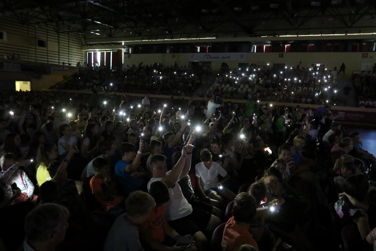 A több száz kisiskolás éjszakai égbolttá varázsolta telefonjával a nézőteret. Így lépett a színpadra Fábry Kornél, a Nemzetközi Eucharisztikus Kongresszus főtitkára. Rövid köszöntőjében azzal fordult a fiatalok felé, hogy aki Istennel él, annak örök élete van, s ez nem is választható – azonban nem mindegy, hogy hol és hogyan töltik el. – Talán azt már tudjátok, hogy nyáron mit csináltok, de az örök életet, azt reméljük, hogy szeretetben, örömben és boldogságban fogjuk tölteni – tette hozzá, majd részletesen szólt a jövő szeptemberi 52. Nemzetközi Eucharisztikus Kongresszusról.