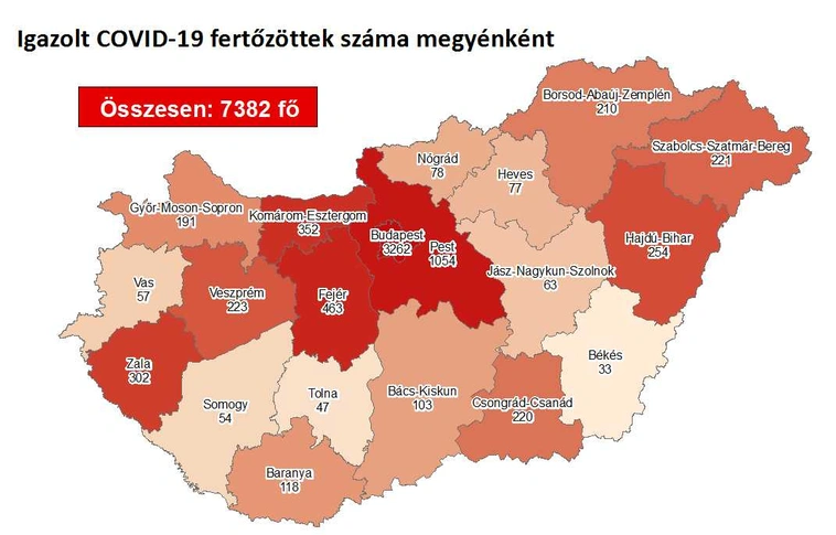 459 újabb magyar állampolgárnál mutatták ki az új koronavírus-fertőzést (COVID-19), ezzel 7382 főre nőtt a hazánkban beazonosított fertőzöttek száma. Elhunyt egy 82 éves krónikus beteg, az elhunytak száma így 621 főre emelkedett, 3944-en pedig már meggyógyultak. Az aktív fertőzöttek száma 2817 fő. Az aktív fertőzöttek 44%-a, az elhunytak 60%-a, a gyógyultak 42%-a budapesti. 120 koronavírusos beteget ápolnak kórházban, közülük 8-an vannak lélegeztetőgépen.
