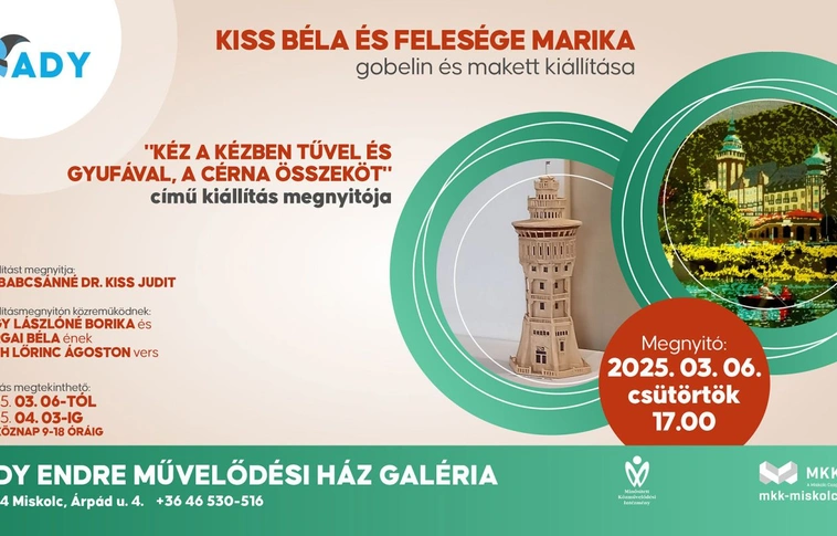 „Kéz a kézben tűvel és gyufával, a cérna összeköt” címmel nyitják meg Kiss Béla és felesége Marika gobelin és makett kiállítását március 6-án csütörtökön 17 órakor az Ady Endre Művelődési Ház Galériáján.