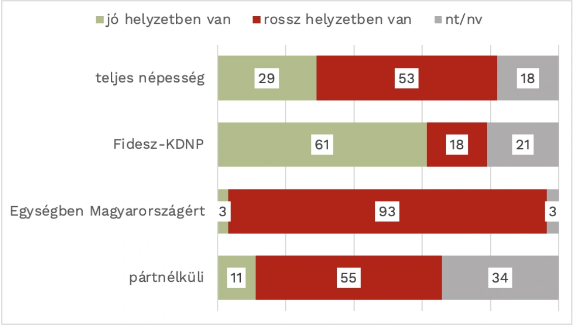 Ennek nyomán a portál azt írja, a politikai törésvonal a felmérés alapján a gazdasági helyzetértékelésben is látványos: az ellenzékiek elsöprő többsége (93%) és a bizonytalanok (55%) nagyobb része úgy válaszolt, hogy a magyar gazdaság rossz helyzetben van. A kormánypárt támogatói ugyanakkor nem fogadják el ezt a helyzetértékelést: a fideszesek 61 százaléka szerint igenis jó helyzetben van a magyar gazdaság, és mindössze 18 százalékuk válaszolt úgy, hogy válságot érzékel.
