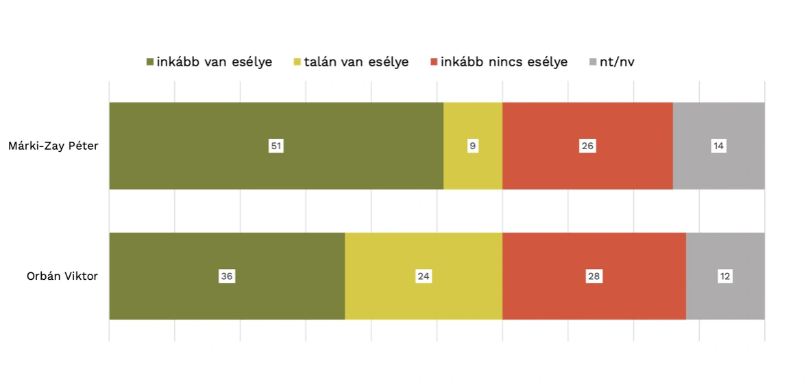 A kutatásból kiderül továbbá: Márki-Zay Péter a választók 51 százaléka szerint tudna sikeresen tárgyalni az uniós támogatások hazahozataláról, Orbán Viktorról ezt jóval kevesebben, csak 36 százaléknyian feltételezik.