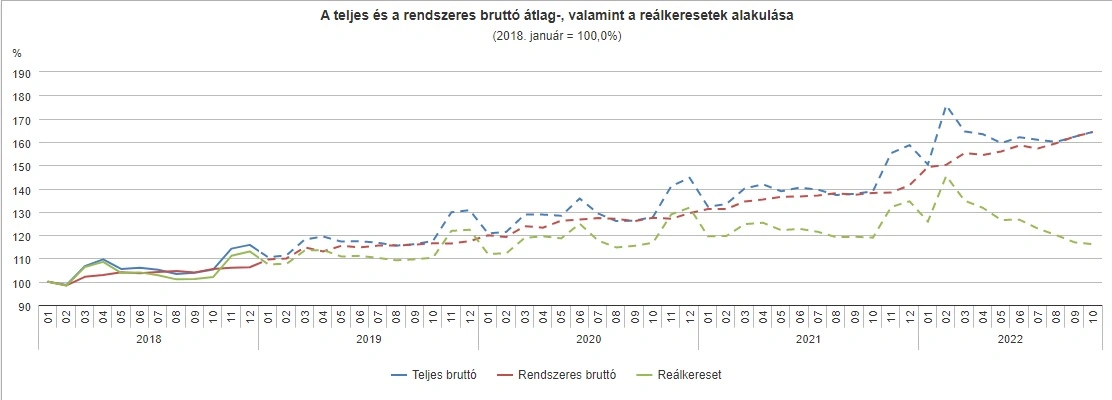 Sajnos az infláció mértéke itt is szerepet játszik az összképben. A reálkereset (bérek plusz infláció) ugyanis ereszkedő ívet mutat a különböző béremelések ellenére is: 2,2 százalékkal csökkent. Magyarán hiába keresünk valamivel többet, mint 2021-ben, értékét számítva olyan, mintha csökkent volna a fizetésünk.