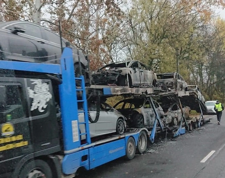 A katasztrófavédelem közleménye szerint tréleren szállított autók gyulladtak ki Szikszón, a Kassai úton.