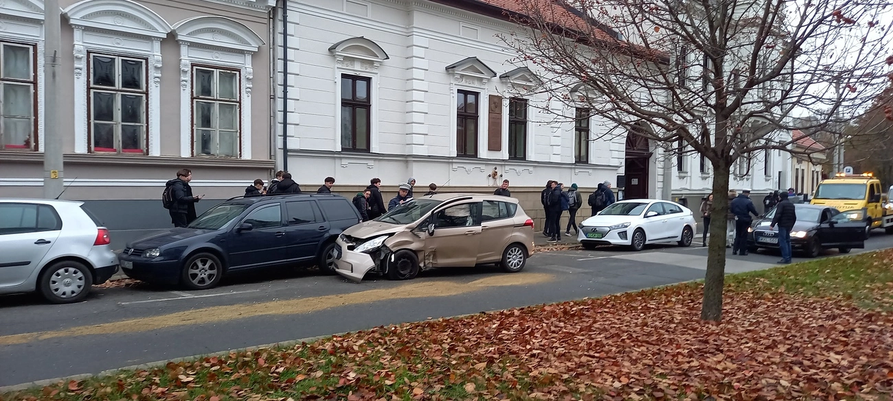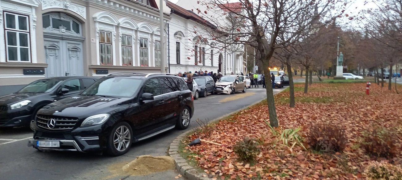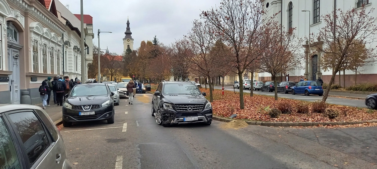 Első ránézésre nehéz megállapítani, hogy a belvárosi református templom mellett, a Palóczy utcában hogyan törhetett össze a fekete Mercedes terepjáró és a pezsgő színű Ford egyterű eleje.