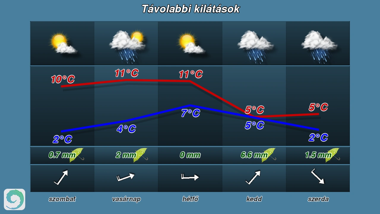 Vasárnap eleinte változóan felhős lesz az ég, majd délnyugat felől erősen megnövekszik a felhőzet. Szórványosan alakulhat ki eső, zápor. A szél többfelé megerősödik. A legalacsonyabb hőmérséklet plusz 1 és 8, a legmagasabb plusz 10 és 15 fok között alakul - olvasható az előrejelzésben.