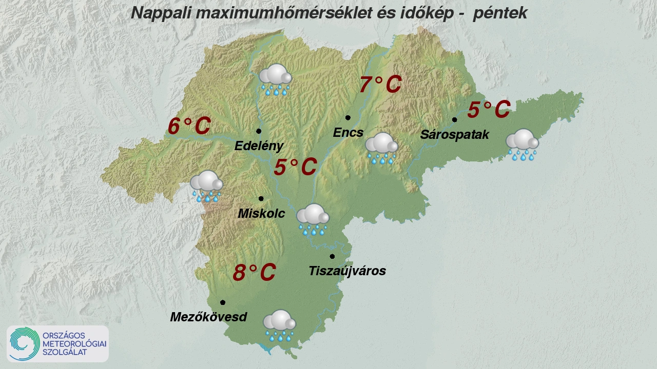Pénteken, január utolsó napján az ország nagyobb részén - átmeneti rövidebb szakadozások mellett - döntően erősen felhős vagy borult lesz az ég, de délután elsősorban a Dunántúl déli és nyugati vidékein akár hosszabb időre is kisüthet a nap. A déli órákig a délnyugati tájakat leszámítva többfelé várható eső, zápor, kezdetben északkeleten néhol ónos eső is előfordulhat. Később fokozatosan csökken a csapadék valószínűsége. A szél többfelé erős, az északi megyékben helyenként viharos lehet. A leghidegebb órákban mínusz 4 és plusz 4, napközben az északkeleti megyékben plusz 3 és 8, másutt 9 és 17 fok között alakul a hőmérséklet.