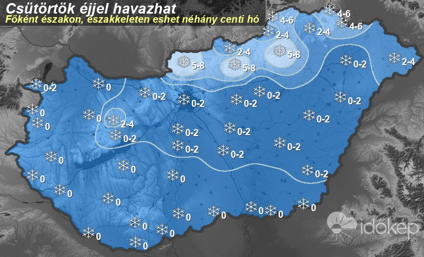 Az előrejelzés szerint főleg északkeleten hullhat havas eső és hó is péntek hajnalban. A Börzsöny, Mátra és Bükk csúcsain 5 centinél is több hó hullhat az Időkép szerint.