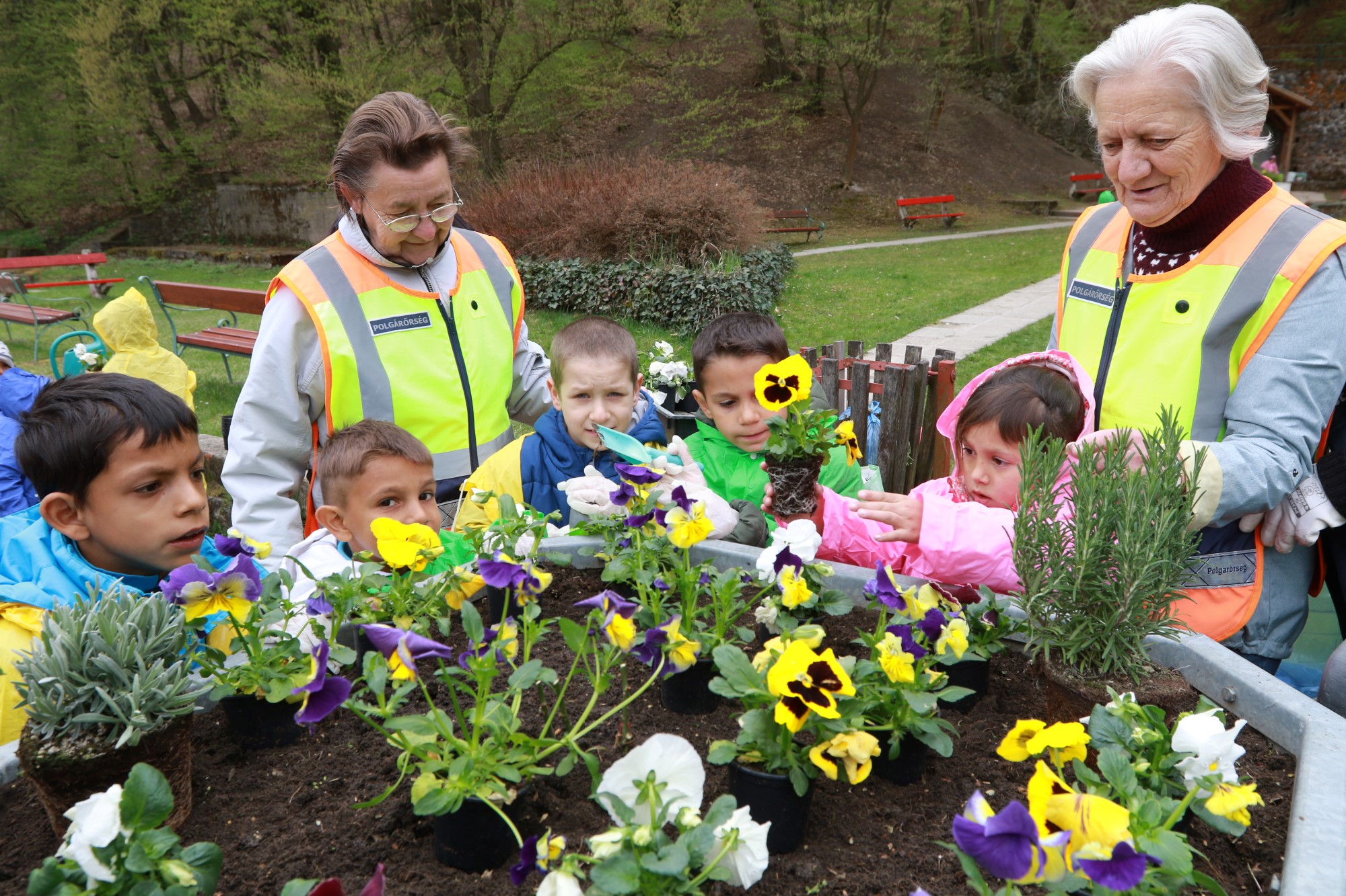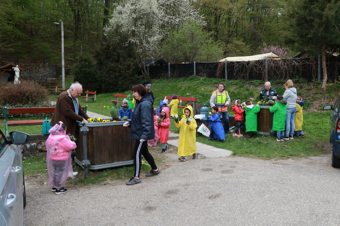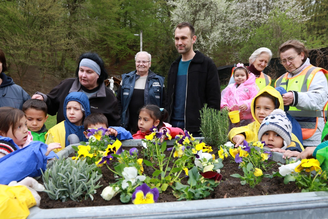 Színes esőkabátban szorgoskodó gyermekekkel telt meg pénteken délelőtt a perecesi Állomás tér. A MIÓVI tagintézményeként működő Vadász úti Óvodába járó csöppségek az óvodapedagógusok és a helyi polgárőrök segítségével ültettek színes virágokat a Vilma-forrás mellé és a tér előtti két virágdézsába.