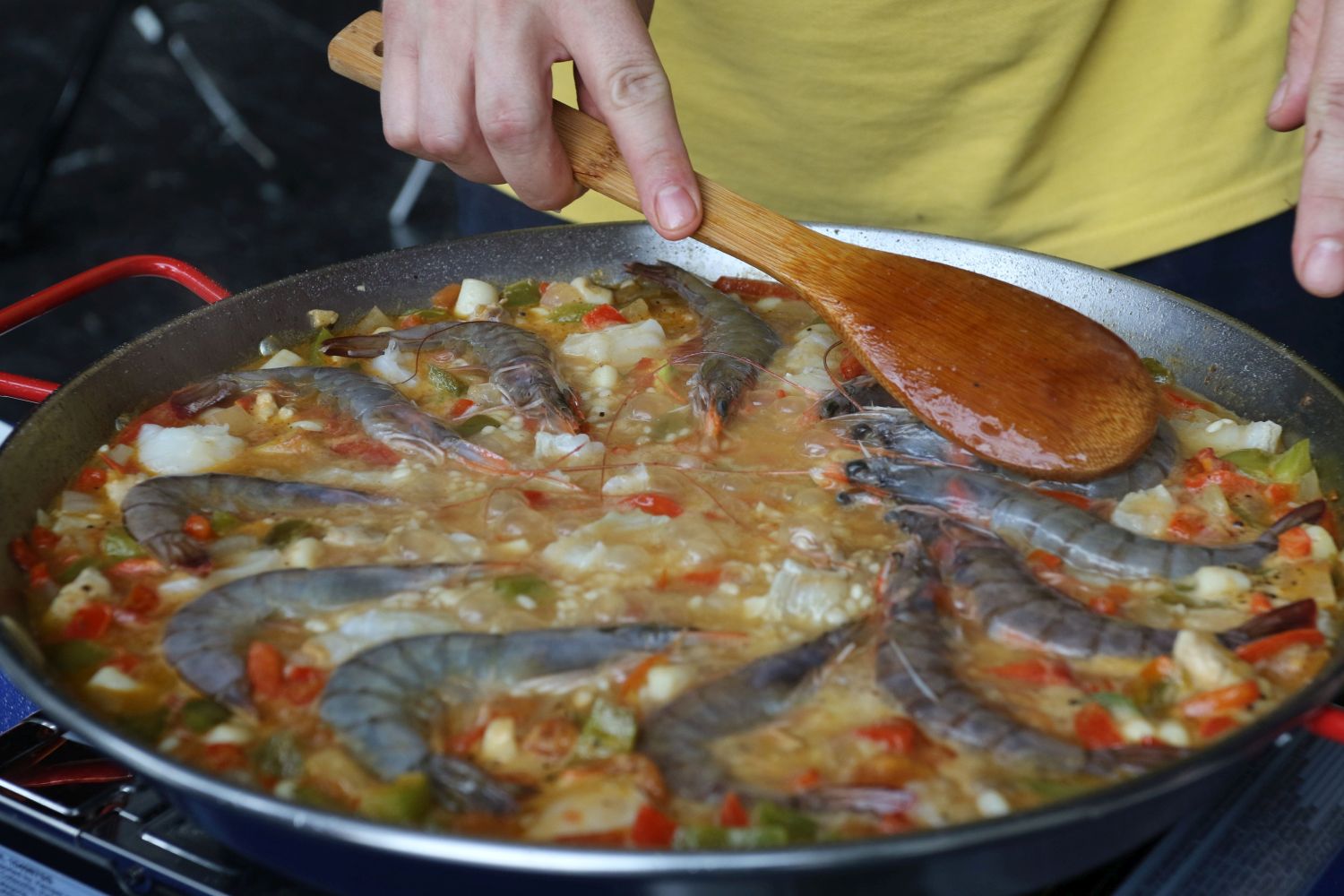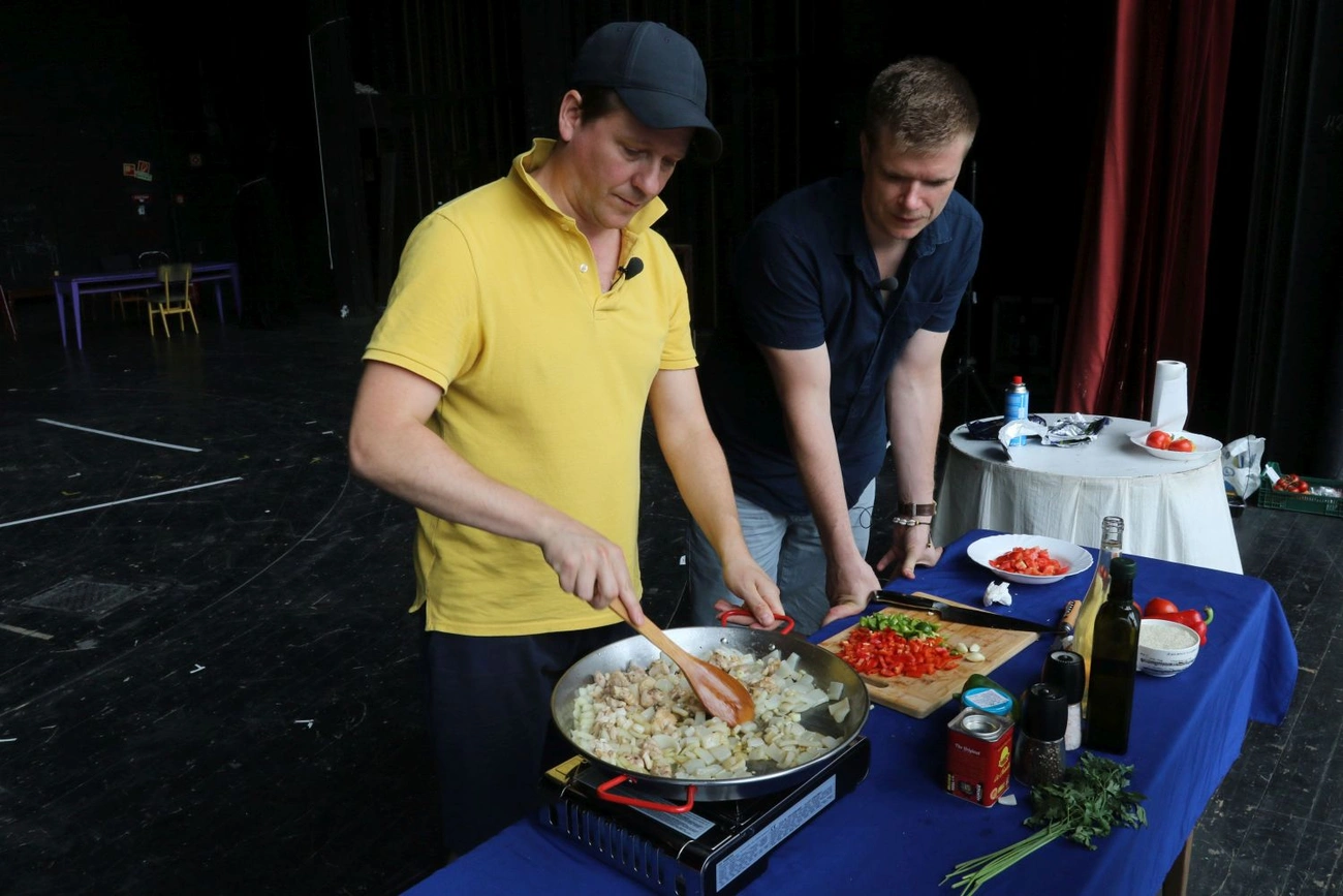 Cser Ádám zeneigazgató a zenekari árok mellett otthonosan mozog a konyhában is. Most a két szerelmét, a színházat és a gasztronómiát hoztuk össze Acéllábos műsorunk GasztroXtreme részében. Az éppen futó Feketeszárú cseresznye díszletét már levették, mikor ott forgattunk, így a háttérben kirajzolódott a színfalak mögötti valóság. A színpad volt a konyha: felállítottuk elmaradhatatlan gázrezsónkat, és előkerültek a különböző alapanyagok is. Cser Ádám egy népszerű spanyol ételt, paellát készített, aminek az alapját a kerekszemű rizs mellett a tőkehalfilé, a tintahal, a garnéla és a kékkagyló adta. Némi bor és sáfrány is került az ételbe, ezzel is erősítve a valenciai ízvilágot. Az acéllábost ez alkalommal tehát paellasütő serpenyőre cseréltük, de egy percre sem bántuk meg. A főzéshez pedig zene is illik: Nagy Nándor, az MNSZ korrepetítora szelídítette meg a zongorát a kedvünkért, és játszott igazi élményzenét.