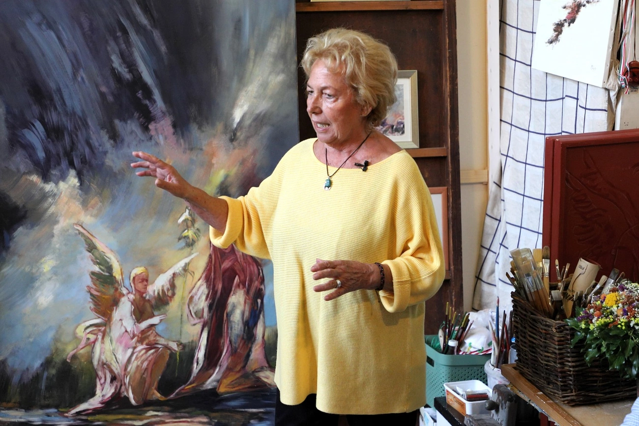 – Olyan festményeimet választottam ki, amiket szeretek. Ezeket hoztam le a padlásról, hogy bemutassam a látogatóknak. A bibliai történet minden képzőművészt érdekel. Én az emberiség történetének kezdetét szerettem volna megfesteni az Ádámot és Évát ábrázoló képen. Itt nagyon fontos, hogy a férfi egy görög oszlopra támaszkodik, ami azt jelenti, hogy a kultúra és a művelődés alapja az antik korban van.