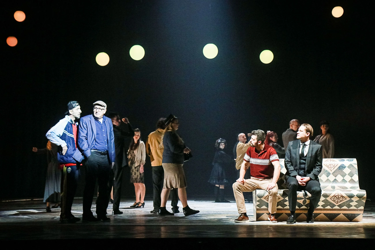 Arra jutottam, hogy nem szabad ollót ragadni, és nem kell nyesegetni a darabot. Szőllősy Klára fordítását felhasználva a regényt színpadra alkalmazó Ari-Nagy Barbara és Szőcs Artur olyan nagyszerűen illesztették saját látomásaikat Bulgakov lázálmai közé, hogy nincs értelme konkolyt keresni. Ez mind búza. A mű tértől és időtől való függetlenségét számos jelenet erősítette: egyszerre volt jelen az ördögöt megszemélyesítő Woland Poncius Pilátus udvarában és beszélgetett a múlt század 20-as éveinek Moszkvájában Hontalan Ivannal és Misa Berliozzal. Az interdimenzionalitás pedig jól állt annak a kontrollált káosznak, amit Bodoky Márk sátánalakja teremtett (igen, itt már kikívánkozik, hogy beszéljek a színészi munkáról, de még tartsuk magunkat kicsit!). Annak ellenére sikerült időtlennek maradnia, hogy számos közéleti utalást tűztek a darabba. Berlioz például csak névben hasonlít egy francia zeneszerzőre, karakterét tekintve inkább más összefüggést teremt PIMasz megjegyzéseivel, mint például azzal, hogy nem szereti a színházat, és az orosz irodalom 80 százalékát kukázná. Végül az ördög iszik a levágott fejéből (nem, még mindig nem beszélünk a színészi játékról). Érdemes szót ejteni az idősíkokat lazán összekötő további kapcsokról. Ilyen például az a zseniális pillanat, ami a Mester és Margarita ikonikus macskáját, Behemótot látja el eredetsztorival (komolyan, egyre nehezebb magamban tartani). Nem lövöm le a poént, de igazán érdekes felvetés született. Ilyen kapocs még Hontalan Iván is, aki egy-egy jelenetben az idő és tér foghézagjába szorul. Oké, nem bírom tovább, jöjjön a színészi munka.