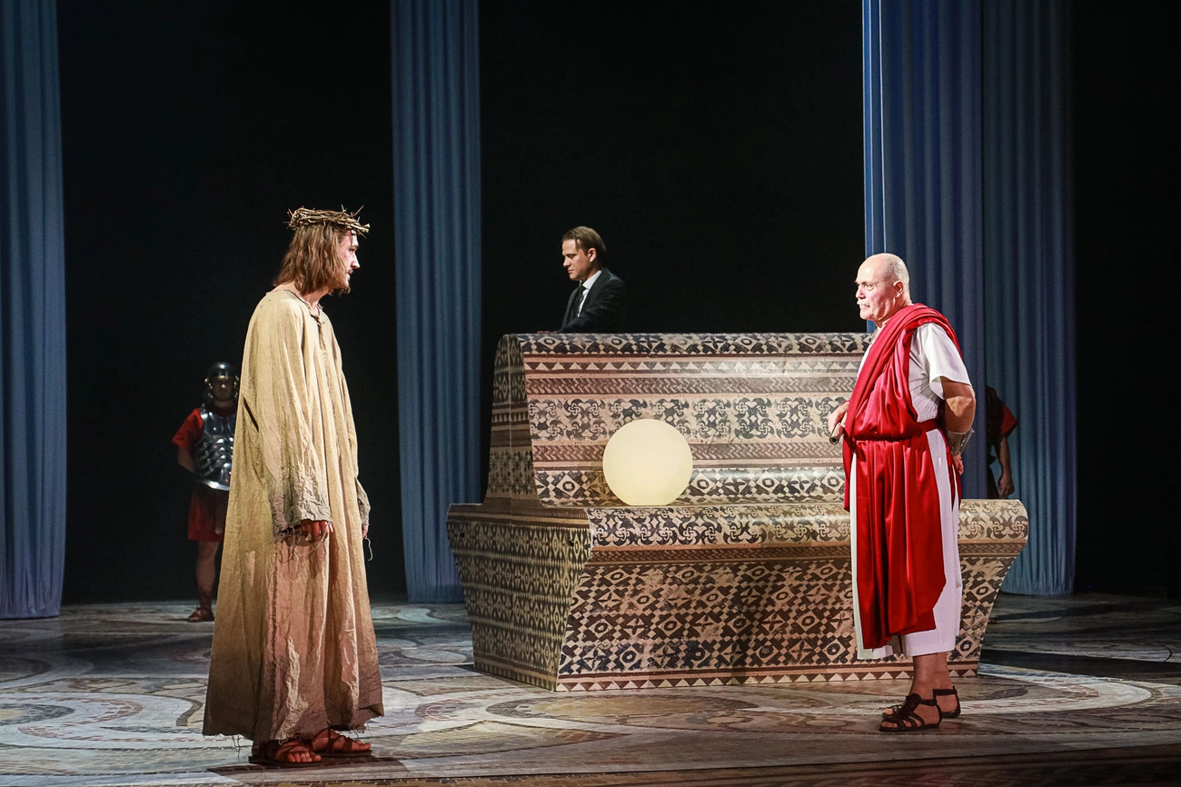 Kezdjük azzal, hogy meglátásom szerint nem voltak gyenge alakítások. Olyanok akadtak legfeljebb, amelyek erőtlenebbnek tűntek a többiekhez képest. A Mester és Margarita közötti szerelmi feszültség talán kevés volt a két szereplő fundamentumát meghatározó kapocsnak - bár ez az alapműben sem volt emlékeim szerint erősebben kidomborítva, szeretik egymást mindhalálig, ennyi, el lett mondva, nem?. Hozzátéve, a főként rendezőként működő Keszég László szerintem kifejezetten jól hozta a karakterét. Azonban nehéz teret nyerni egy ilyen darabban Rózsa Krisztián bimbózó őrülete, Salat Lehel Demeter Szilárdjának Berliozának önhitt ateizmusa, Simon Zoltán – színpadon ritkán látott, kiváló mimikával verselő – Rjuhinja és Gáspár Tibor Pilátusa mellett, aki nem mossa kezeit, hanem időszámításkori Rambóként visszavág. Az Afraniust és Sztravinszkij doktort meglepő érettséggel játszó Béres Bencét is érdemes figyelni. Az igazi borzongást azonban az ördögi négyes fogat és Farkas Sándor Jesuája hozta - utóbbi egyszerűen kiváló volt, a kihallgatás jelenete számomra az a pont a darabban, ami meggyőzött: itt mot tényleg figyelni kell.