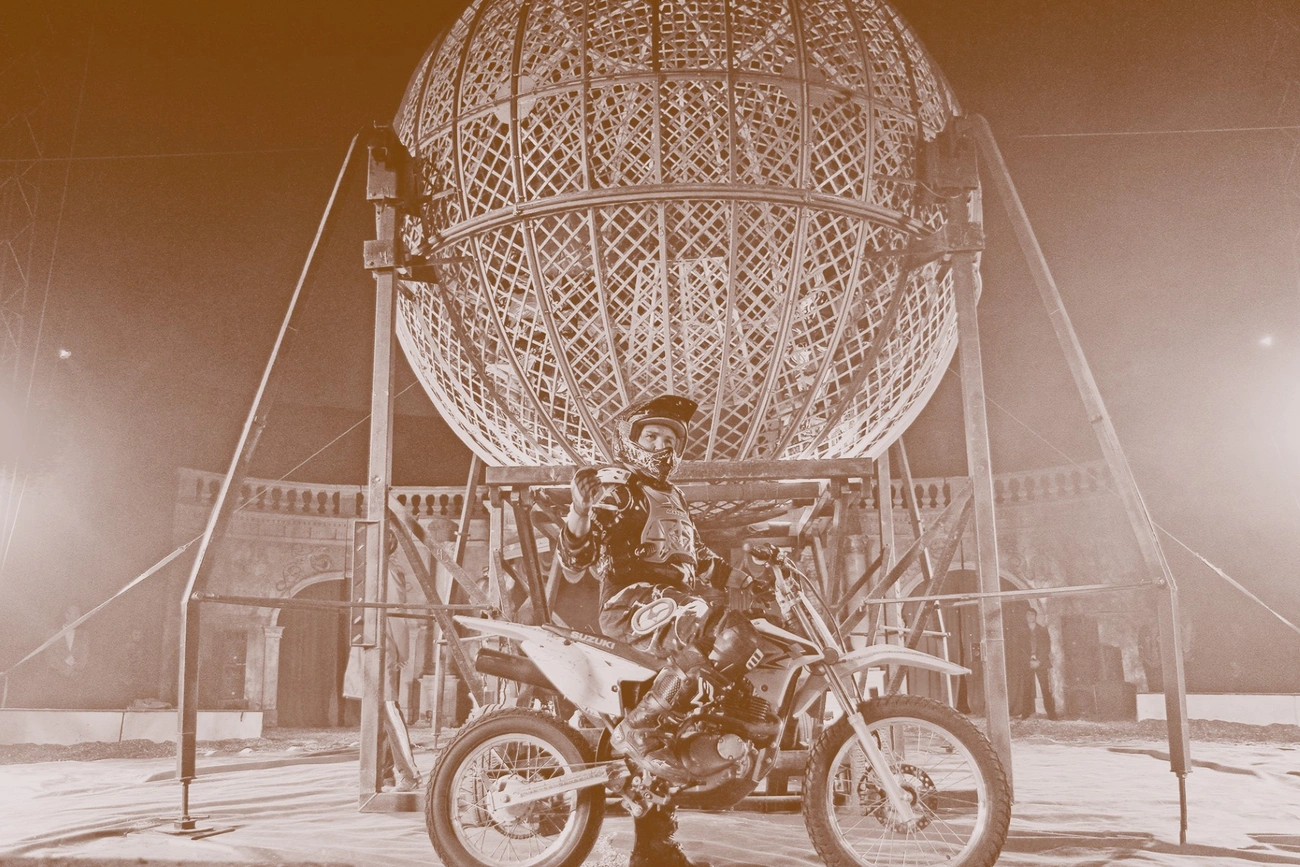 Miután az előadás megkezdéséig még volt legalább húsz perc, alaposan megnéztem magamnak ezt a csodát. Egy gömb formájú óriás acélrácsos ketrec volt, nagy és erős hajlított bordákkal merevítve a gömb fenti csúcsától az alsó csúcsig. Az átmérője talán 4-5 méter lehetett. A gömb aljában állt a két motor. Gyuszi szomszéd azt mondta, hogy ezek príma „krosszos” motorok. Én ehhez nem értettem, de látva, hogy apám bólogat, én is elhittem. Érdekes volt a nézőtér, mert nem a földön álltunk, hanem a gömb körül, olyan három méter magasságban, fadeszkás állóhelyen. Szélessége nem volt több mint másfél méter, így szinte bent éreztük magunkat a gömbben. Egyszer csak megbökte apám az oldalamat és a gömb aljára mutatott. Kinyílt a ketrec kis fémajtaja, és belépett rajta egy motoros. Miután bezárták az ajtót, a hangosbeszélő közölte, hogy a motoros, akit látunk, perceken belül megkísérli a lehetetlent, és halált megvető bátorsággal száguldani fog a gömbben. A közönség néma csendben figyelte a férfit, aki sisakot tett a fejére, majd berúgta az egyik motort. Éktelen zajjal és füsttel megindult, először csak kis köröket rajzolva haladt a gömb alján. Kezdtem azt gondolni, hogy ez nem is olyan nagy kunszt, amikor a motoros gázt adott és vízszintesen kezdett el körözni már abban a magasságban, ahol álltunk. Aztán hirtelen irányt váltott, és függőleges köröket írt le, és én azt vártam, hogy bármelyik pillanatban lezuhan. De nem ez történt, hanem amint befejezte, bejött a társa is, és most már ketten száguldoztak le-föl, majd átlósan, egymás fölött meg alatt. A nép tombolt, mert hát ilyet még nem látott. De még mindig nem volt vége, mert egyszer csak a nő is bejött, és megállt a gömb aljában. A közönség lélegzetvisszafojtva figyelte, mi fog még következni. A két motoros elindult, és szédületes tempóban motorozták minden irányból körbe a nőt. Aztán vége lett. A motorok elhallgattak, lassan a füst is eloszlott, jelezve, véget ért a csoda, és mindenki elindulhat hazafelé.