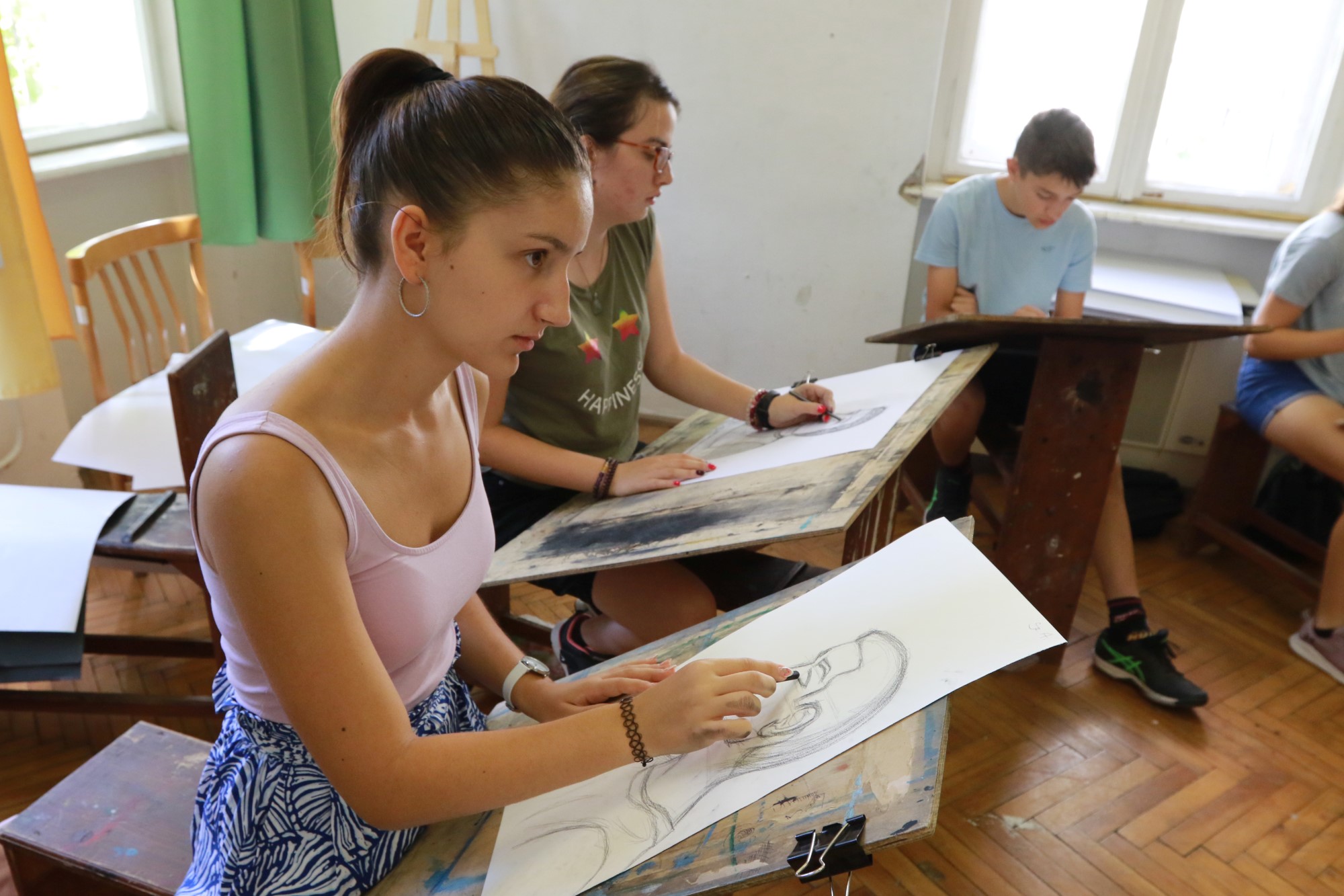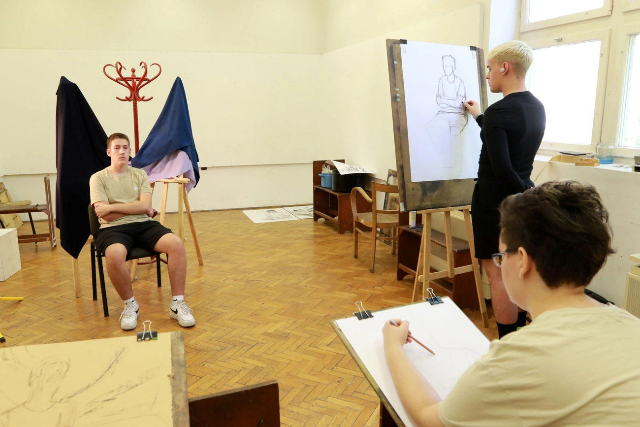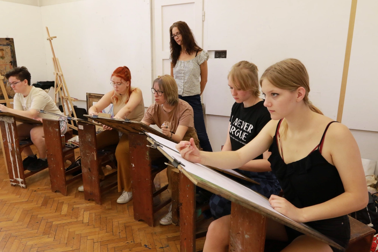 – Ezen a héten különféle tanulmányrajzokat készítünk. A megfigyelés utáni rajzolást gyakoroljuk az első héten. A diákok megtanulnak három dimenzióból kettő dimenzióba leképezni, továbbá lehetőségük van kísérletezni, így például akvarellt és akrilt is kipróbálni – hangzott el Radics Mártától.