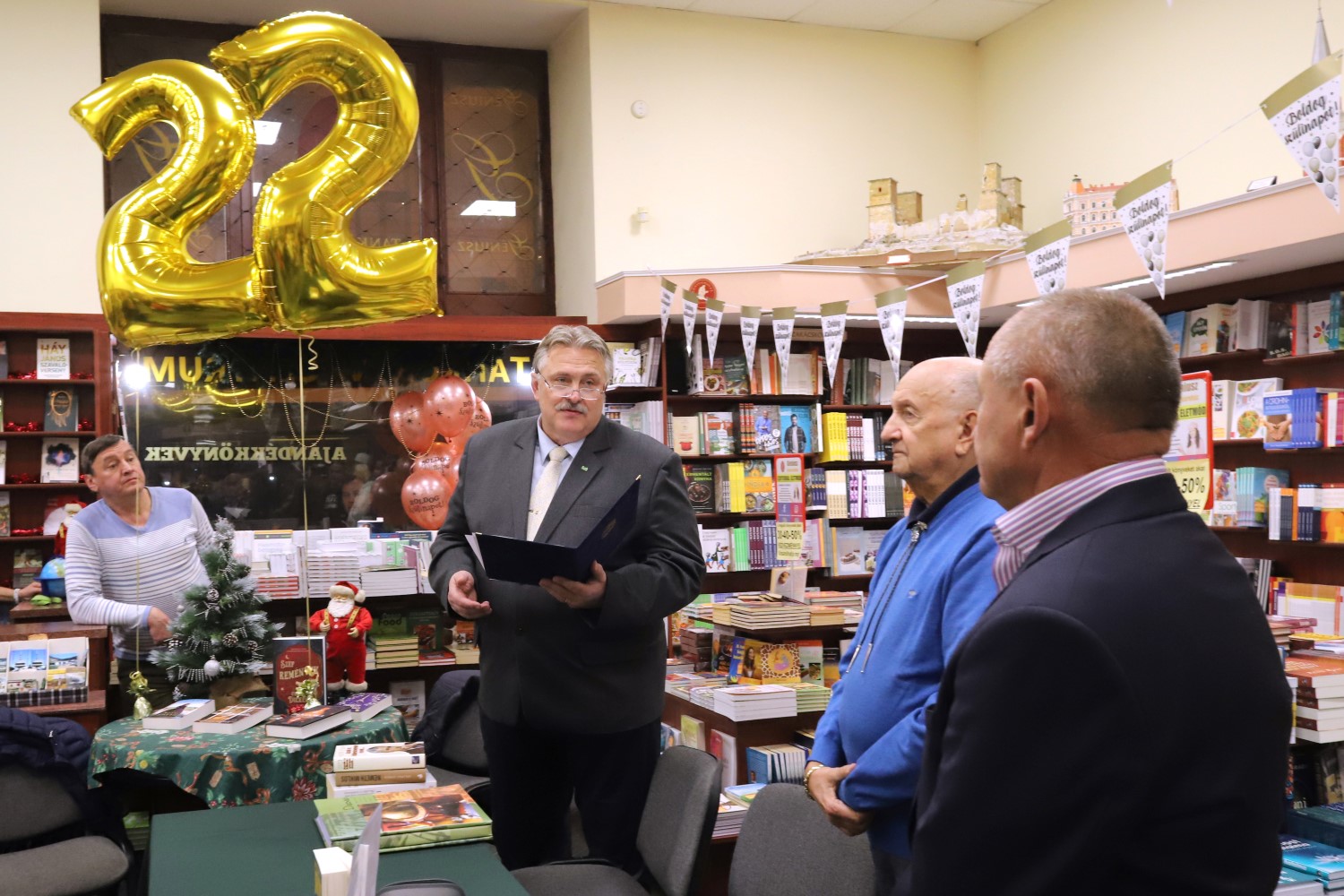 Az ünnepen részt vett és köszöntő beszédet mondott Miskolc polgármestere. Veres Pál régi barátként köszöntötte Kondás Vilmost, majd hosszan méltatta a könyváruház elmúlt 22 évét. Időutazása során felidézte, honnan indult és hogyan jutott el a Bródy-palotába költözésig a könyváruház. Megtudhattuk, hogy 1992-ben nyitották meg a város első, magánkézben lévő könyvesboltját, a Belvárosi Könyvesboltot, ahová országszerte ismert szerzőket is meghívtak író-olvasó találkozókra. Idő közben aztán több városban nyitottak boltot, láncolattá fejlődtek, majd 2000. december 1-jén megnyílt a mai helyén, a Bródy-palotában a könyváruház, ahol közel 600 négyzetméteren mintegy 45 ezer könyvcím várja az olvasásszerető vásárlókat.