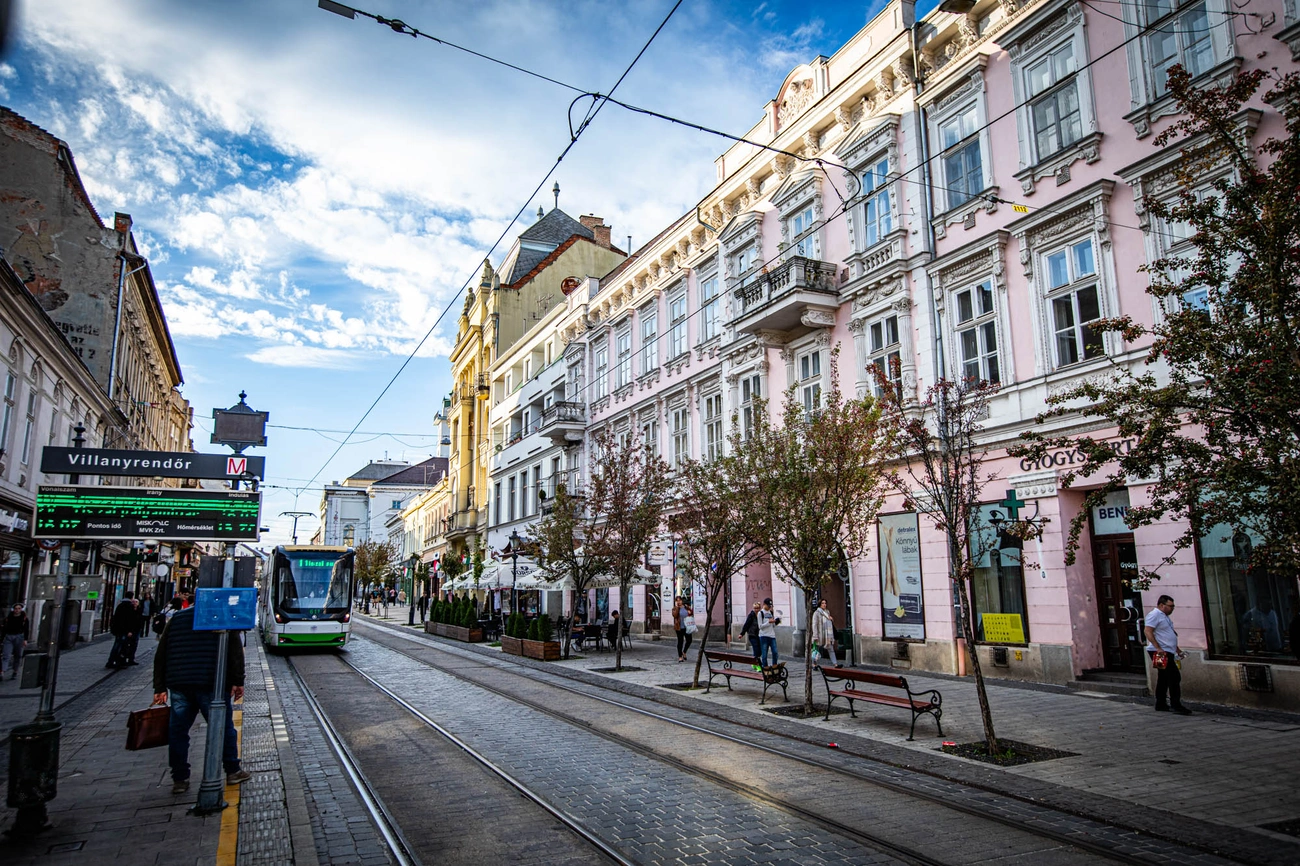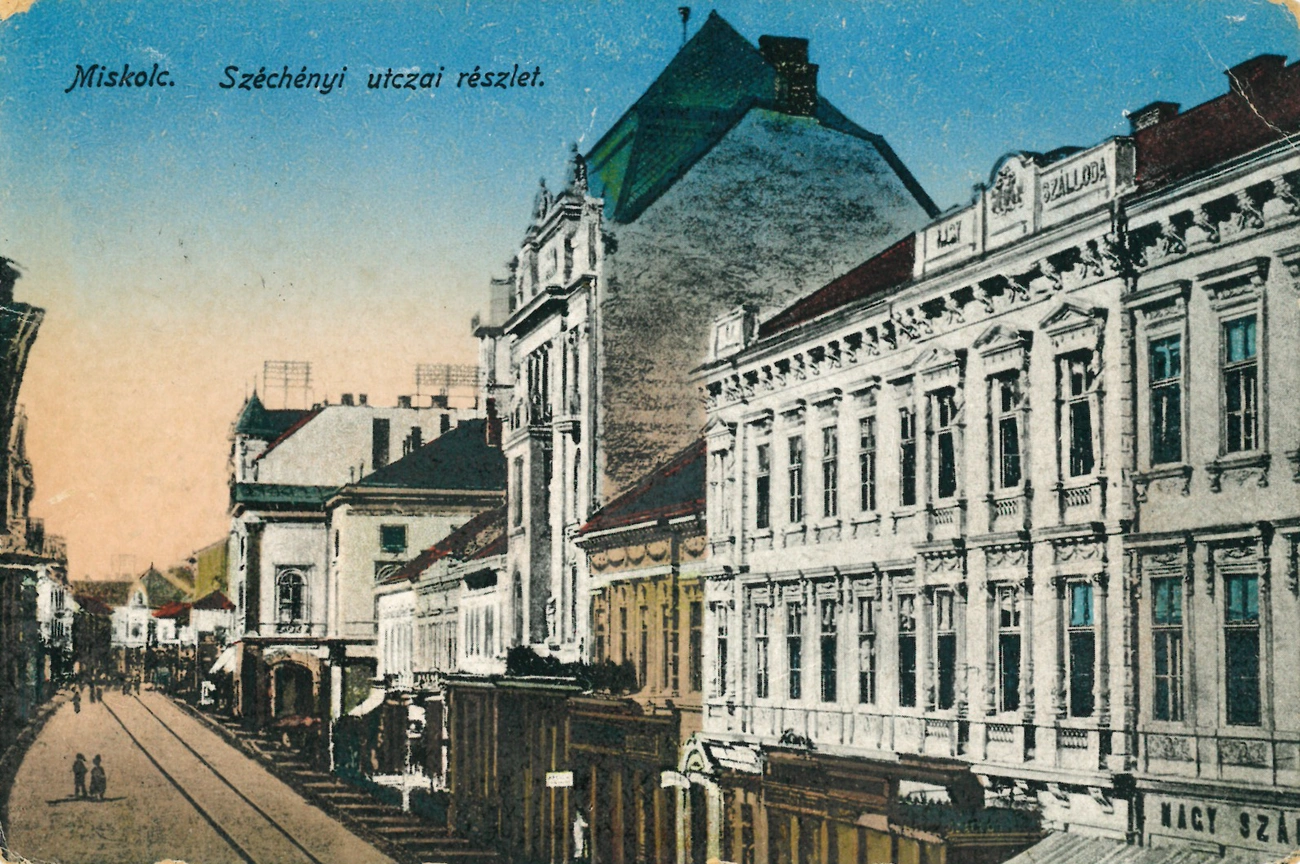 A képpáron jól látható, a házak többsége ma is hasonlóan néz ki. A jobb sarokban a 33. szám alatt az egykori Három Rózsa Szálló Széchenyi utcai homlokzatának részlete látható. Szomszédját, a Szabó-házat (31. szám) Szabó Gyula gyógyszerész építtette, az eredetileg egyemeletes a 20. században háromemeletessé alakították át, homlokzatát teljesen megváltoztatták és megfosztották minden díszítésétől. A 29. szám alatt található az egykori Hitelintézeti palota látható, a monumentális, háromemeletes épület terveit Hajós Alfréd cége készítette. A földszinten üzleteket, az emeleteken lakásokat alakítottak ki. A földszinti üzletrészben 2010-ben a Tesco nyitott szupermarketet. Kevéssé ugyan, de látható még a Silbiger-, a László- és a Dálnoky-ház is, mint ahogyan látható a Miskolci Nemzeti Színház épülete és a Weidlich-palota azóta lebontott két tornya is. Utóbbi épület miatt egészen biztos, hogy 1911 után készült a felvétel, mivel Weidlich Pál bérpalotája ekkorra épült fel.