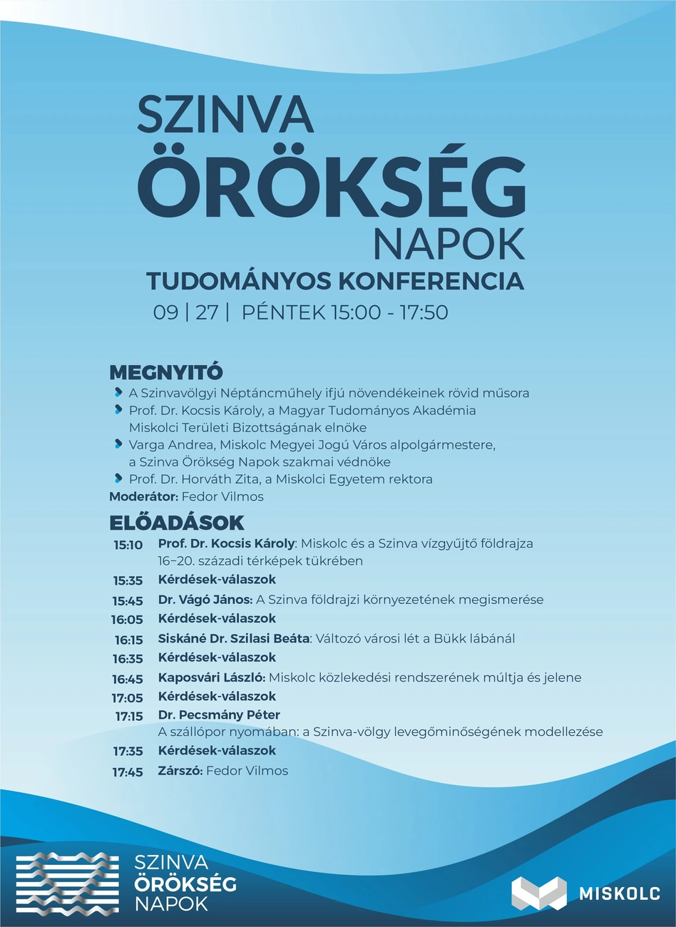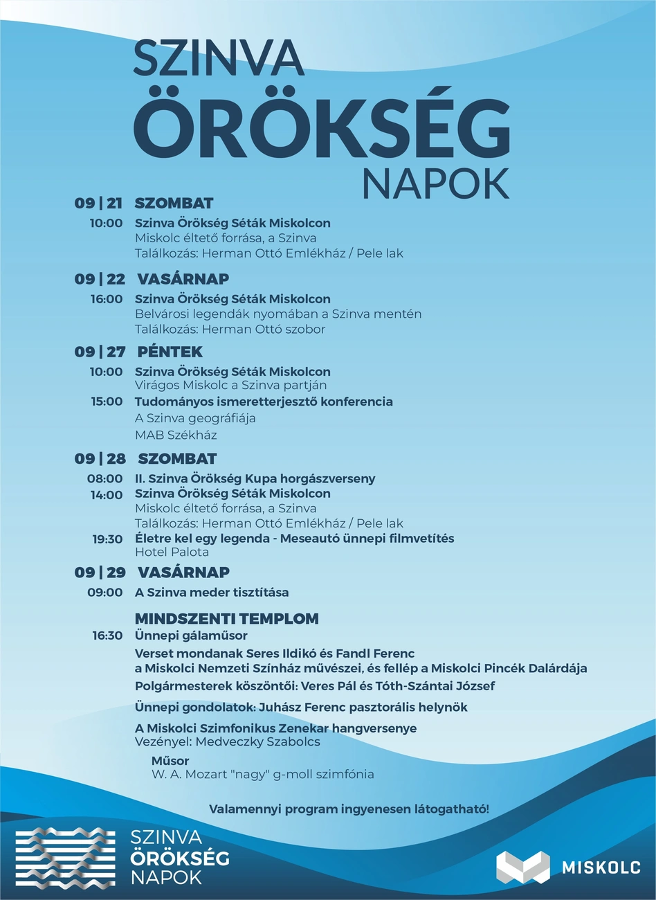 Tudományos konferenciával kezdődik pénteken délután háromtól a Szinva Örökség Napok a Miskolci Akadémiai Bizottság Székházában. A tudományos ülésen a Szinva geográfiája a téma. A három napos fesztivál programjában folytatódnak a városjáró séták, és lesz számos más közösségi program is. Így horgászverseny, Szinva takarítás és a Lillafüredi Palotaszállóban vetítik majd a most 90 éves Meseautót, melyet a romantikus helyszínen forgattak. A rendezvénysorozatot elegáns koncert zárja a Mindszenti templomban vasárnap fél öttől. Seres Ildikó és Fandl Ferenc, a Miskolci Nemzeti Színház művészei mondanak verset, a Miskolci Szimfonikus Zenekar pedig W. A. Mozart népszerű darabját a "nagy" g-moll szimfóniát játssza. Vezényel: Medveczky Szabolcs - tudtuk meg közleményben Czikora Ágnestől, a BluePixel Kommunikációs és Produkciós Iroda ügyvezető igazgatójától.