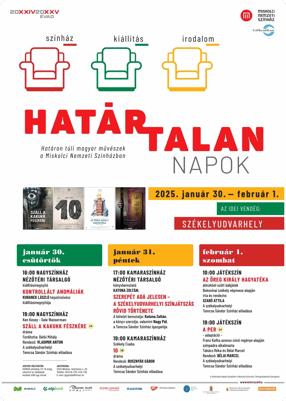 Miskolcra érkezik a kultikus Száll a kakukk fészkére Vladimir Anton rendezésében, Franz Kafka azonos című regénye alapján A per adaptációja lesz látható Bélai Marcel rendezésében, és egy ismerős is beköszön, ugyanis Rusznyák Gábor rendezésében készült a 10 című előadás Székelyudvarhelyen, melyet szintén a Határtalan Napok során láthat a miskolci közönség.