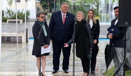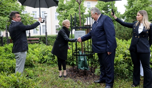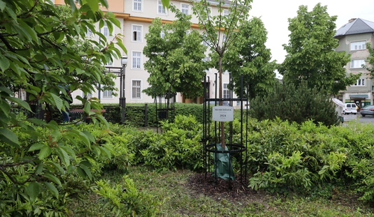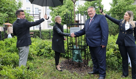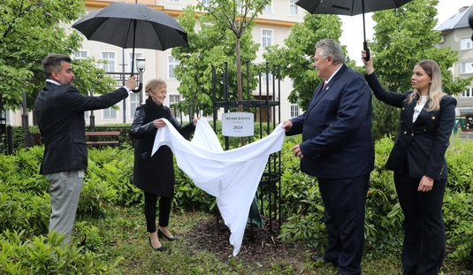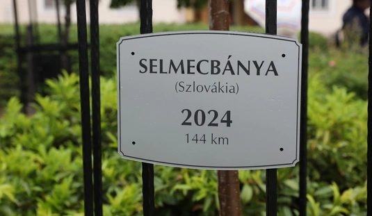 Miskolc és Selmecbánya testvérvárosi fájának dísztáblaavatása a Hősök terén található testvérvárosi fasoron
