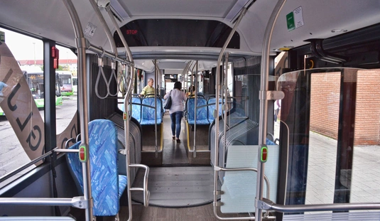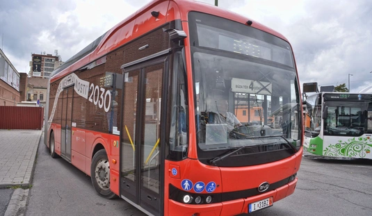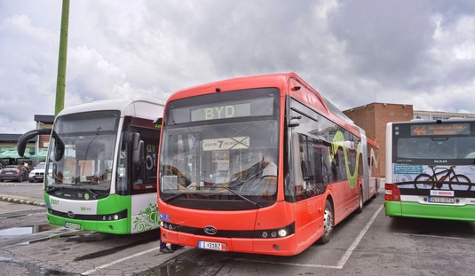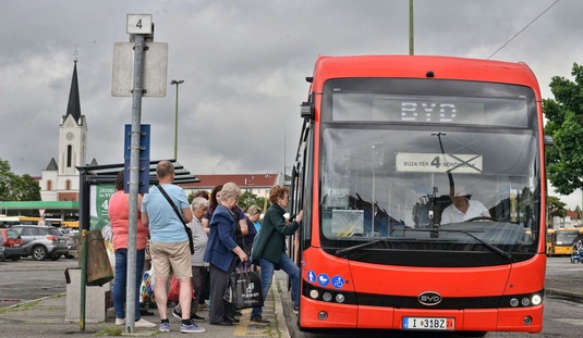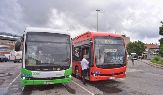 Piros BYD csuklós autóbuszt tesztel az MVK