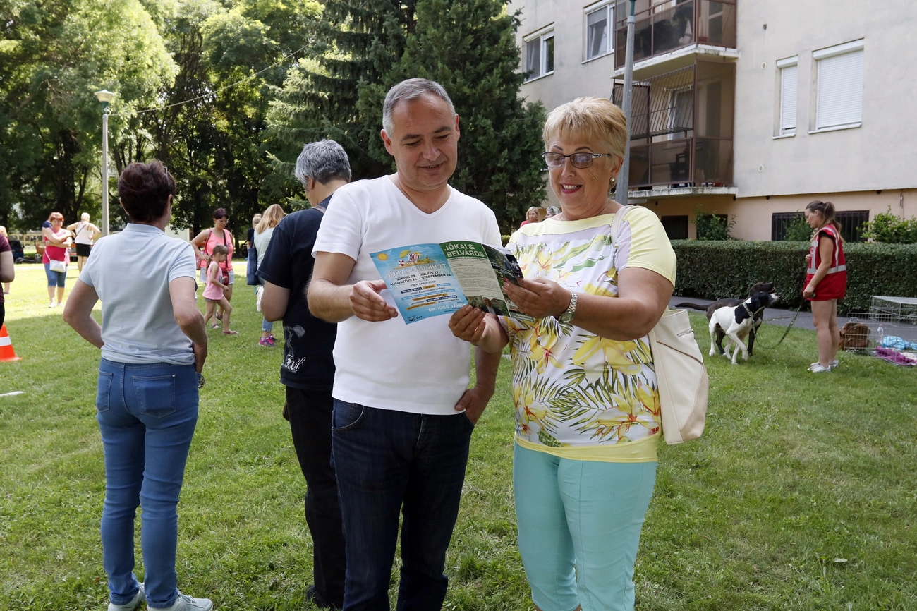 Azokat a kutyákat meg is lehet simogatni? – kérdezte lelkesen egy kislány, aki maga mögött hagyva a szüleit sietett a kutyabemutató felé. Többségében kisgyermekes családok élvezték a nyári napsütést és a számtalan lehetőséget a délután eltöltésére a lakótelepen.