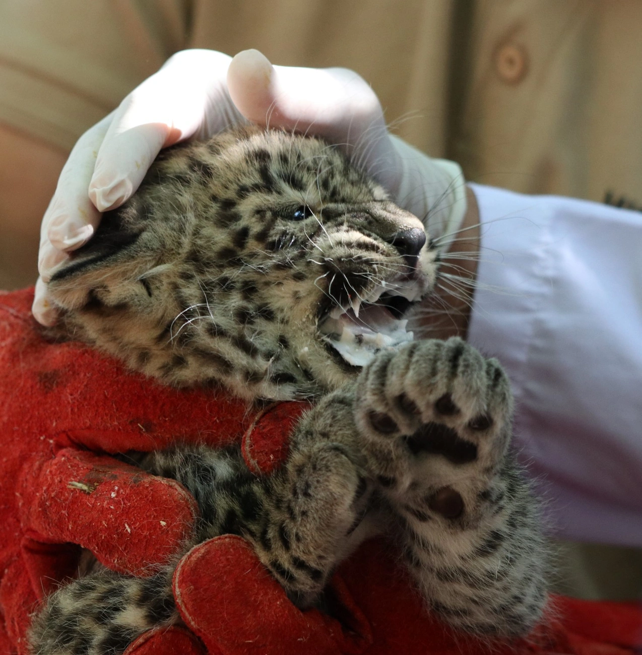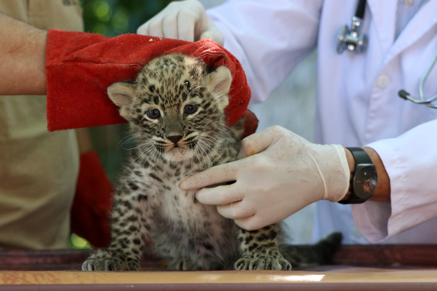 Hathetes Touran kishúga, és makkegészséges. A leopárdkölyök ma esett át az első vizsgálaton. Ő az állatkert perzsaleopárd párjának második kölyke. Most még csak a nagyon szerencsések láthatják, anyja ugyanis féltve őrzi.