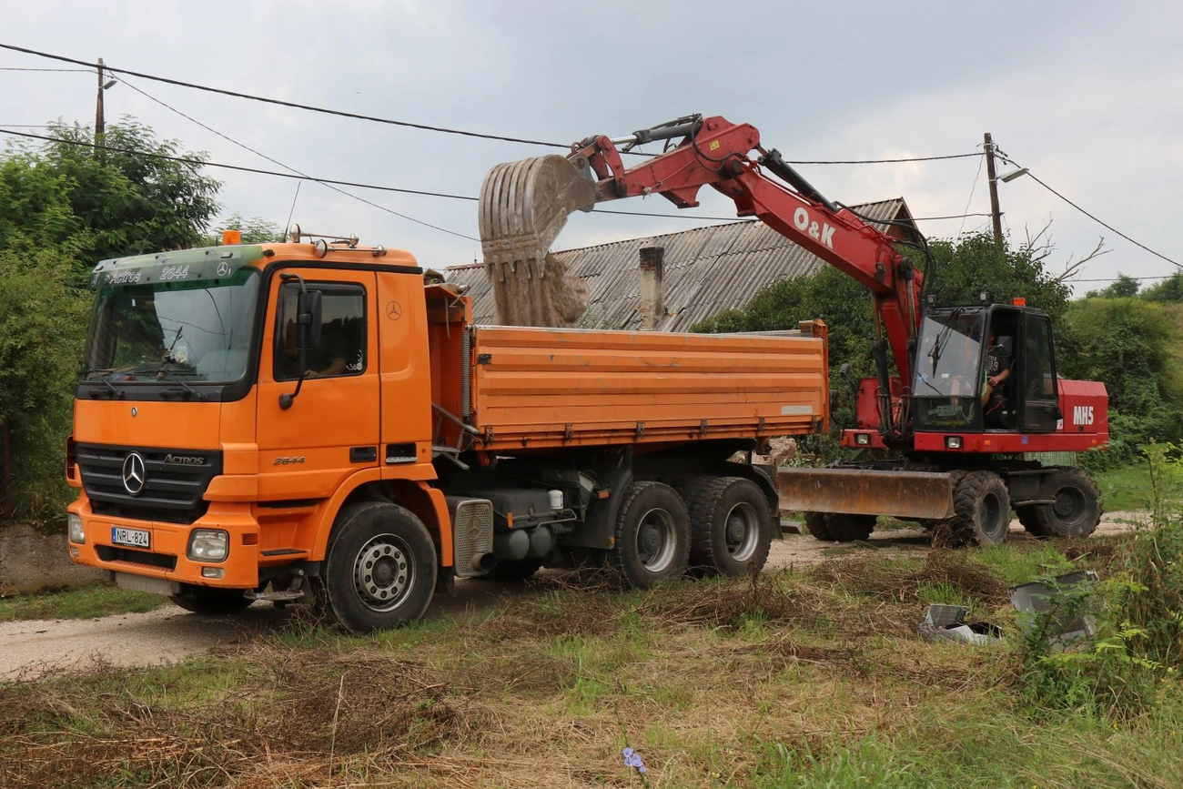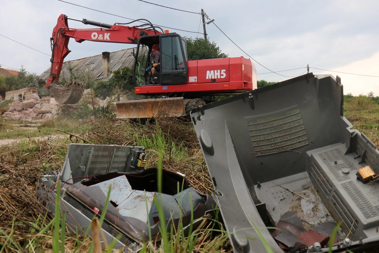 Kutyavonítás kíséri utunkat a sáros utcában. A markológéptől tisztes távolságban gyerekek lesik, mi történik a félig már elbontott-elhordott házzal. A helyszínen megtudjuk: a lakók hónapokkal ezelőtt elhagyták a házat, azóta tokostul-üvegestül eltűntek az ablakok, ajtót se nagyon látni már az önkormányzat által megvásárolt ingatlanban.